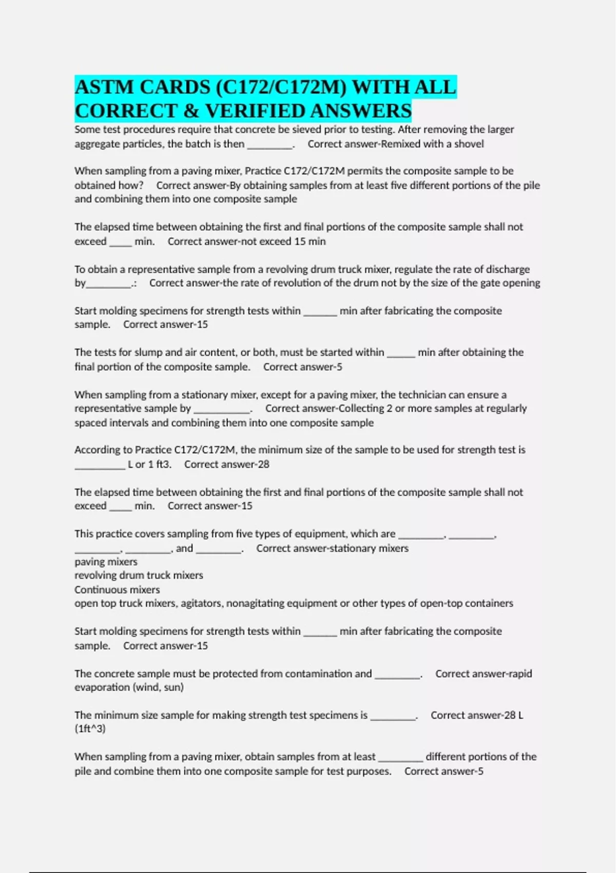 ASTM CARDS (C172/C172M) WITH ALL CORRECT & VERIFIED ANSWERS