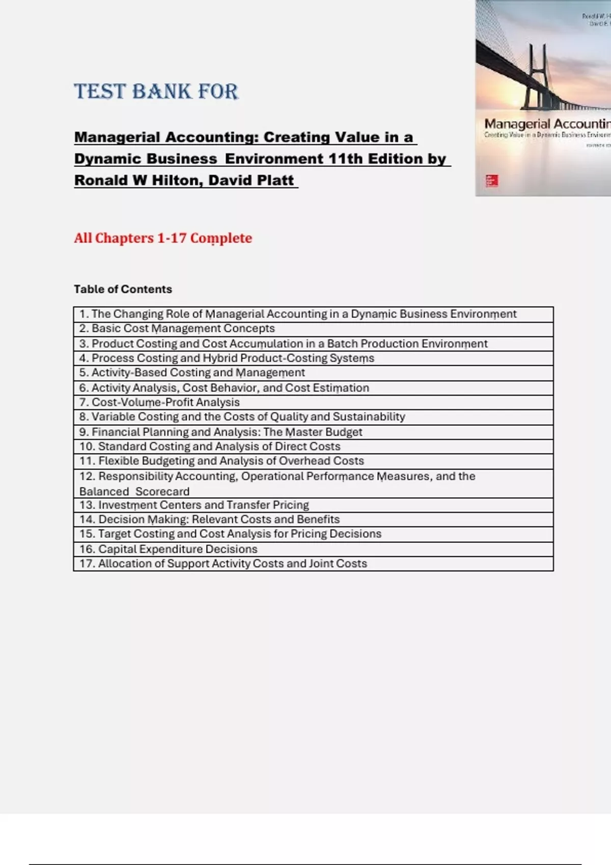 Managerial Accounting: Creating Value in a Dynamic Business Environment (11th Edition) – Hilton & Platt – Complete Test Bank for All Chapters (1–17)