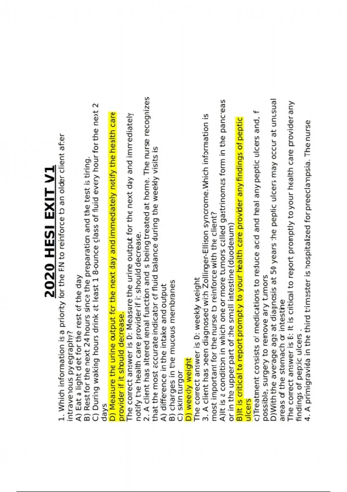 1. Which information is a priority for the RN to reinforce to an older client after intravenous pylegraphy? A) Eat a light diet for the rest of the day B) Rest for the next 24 hours since the preparation and the test is tiring. C) During waking hours drink at least 1 8-ounce glass of fluid every hour for the next 2 days D) Measure the urine output for the next day and immediately notify the health care provider if it should decrease. The correct answer is D: Measure the urine output for the next day and immediately notify the health care provider if it should decrease. 2. A client has altered renal function and is being treated at home. The nurse recognizes that the most accurate indicator of fluid balance during the weekly visits is A) difference in the intake and output B) changes in the mucous membranes C) skin turgor D) weekly weight The correct answer is D: weekly weight 3. A client has been diagnosed with Zollinger-Ellison syndrome.Which information is most important for the nurse to reinforce with the client? A)It is a condition in which one or more tumors called gastrinomas form in the pancreas or in the upper part of the small intestine (duodenum) B)It is critical to report promptly to your health care provider any findings of peptic ulcers c)Treatment consists of medications to reduce acid and heal any peptic ulcers and, if possible, surgery to remove any tumors D)With the average age at diagnosis at 50 years the peptic ulcers may occur at unusual areas of the stomach or intestine The correct answer is B: It is critical to report promptly to your health care provider any findings of peptic ulcers . 4. A primigravida in the third trimester is hospitalized for preeclampsia. The nurse determines that the client’s blood pressure is increasing. Which action should the nurse take first? A) Check the protein level in urine B) Have the client turn to the left side C) Take the temperature D) Monitor the urine output The correct answer is B: Have the client turn to the left side 5. The nurse is caring for a client in atrial fibrillation. The atrial heart rate is 250 and the ventricular rate is controlled at 75. Which of the following findings is cause for the most concern? A) Diminished bowel sounds B) Loss of appetite C) A cold, pale lower leg D) Tachypnea The correct answer is C: A cold, pale lower leg 6. The client with infective endocarditis must be assessed frequently by the home health nurse. Which finding suggests that antibiotic therapy is not effective, and must be reported by the nurse immediately to the healthcare provider? A) Nausea and vomiting B) Fever of 103 degrees Fahrenheit (39.5 degrees Celsius) C) Diffuse macular rash D) Muscle tenderness The correct answer is B: Fever of 103 degrees F (39.5 degrees C) 7. A client who had a vasectomy is in the post recovery unit at an outpatient clinic. Which of these points is most important to be reinforced by the nurse? A) Until the health care provider has determined that your ejaculate doesn't contain sperm, continue to use another form of contraception. B)This procedure doesn't impede the production of male hormones or the production of sperm in the testicles. The sperm can no longer enter your semen and no sperm are in your ejaculate. C) After your vasectomy, strenuous activity needs to be avoided for at least 48 hours. If your work doesn't involve hard physical labor, you can return to your job as soon as you feel up to it. The stitches generally dissolve in seven to ten days. D)The health care provider at this clinic recommends rest, ice, an athletic supporter or over-the-counter pain medication to relieve any discomfort. The correct answer is A: Until the health care provider has determined that your ejaculate doesn't contain sperm, continue to use another form of contraception. 8. A client who is to have antineoplastic chemotherapy tells the nurses of a fear of being sick all the time and wishes to try acupuncture. Which of these beliefs stated by the client would be incorrect about acupuncture? A)Some needles go as deep as 3 inches, depending on where they're placed in the body and what the treatment is for. The needles usually are left in for 15 to 30 minutes. B) In traditional Chinese medicine, imbalances in the basic energetic flow of life — known as qi or chi — are thought to cause illness. * C) The flow of life is believed to flow through major pathways or nerve clusters in your body. D) By inserting extremely fine needles into some of the over 400 acupuncture points in various combinations it is believed that energy flow will rebalance to allow the body's natural healing mechanisms to take over. The correct answer is C: The flow of life is believed to flow through major pathways or nerve clusters in your body. 9. The nurse is discussing with a group of students the disease Kawasaki. What statement made by a student about Kawasaki disease is incorrect? A)It also called mucocutaneous lymph node syndrome because it affects the mucous membranes (inside the mouth, throat and nose), skin and lymph nodes. B)In the second phase of the disease, findings include peeling of the skin on the hands and feet with joint and abdominal pain C)Kawasaki disease occurs most often in boys, children younger than age 5 and children of Hispanic descent D)Initially findings are a sudden high fever, usually above 104 degrees Fahrenheit, which lasts 1 to2 weeks The correct answer is C: Kawasaki disease occurs most often in boys, children younger than age 5 and children of Hispanic descent 10. A client has viral pneumonia affecting 2/3 of the right lung. What would be the best position to teach the client to lie in every other hour during first 12 hours after admission? A) Side-lying on the left with the head elevated 10 degrees B) Side-lying on the left with the head elevated 35 degrees C) Side-lying on the right wil the head elevated 10 degrees D) Side-lying on the right with the head elevated 35 degrees The correct answer is A: Side-lyi