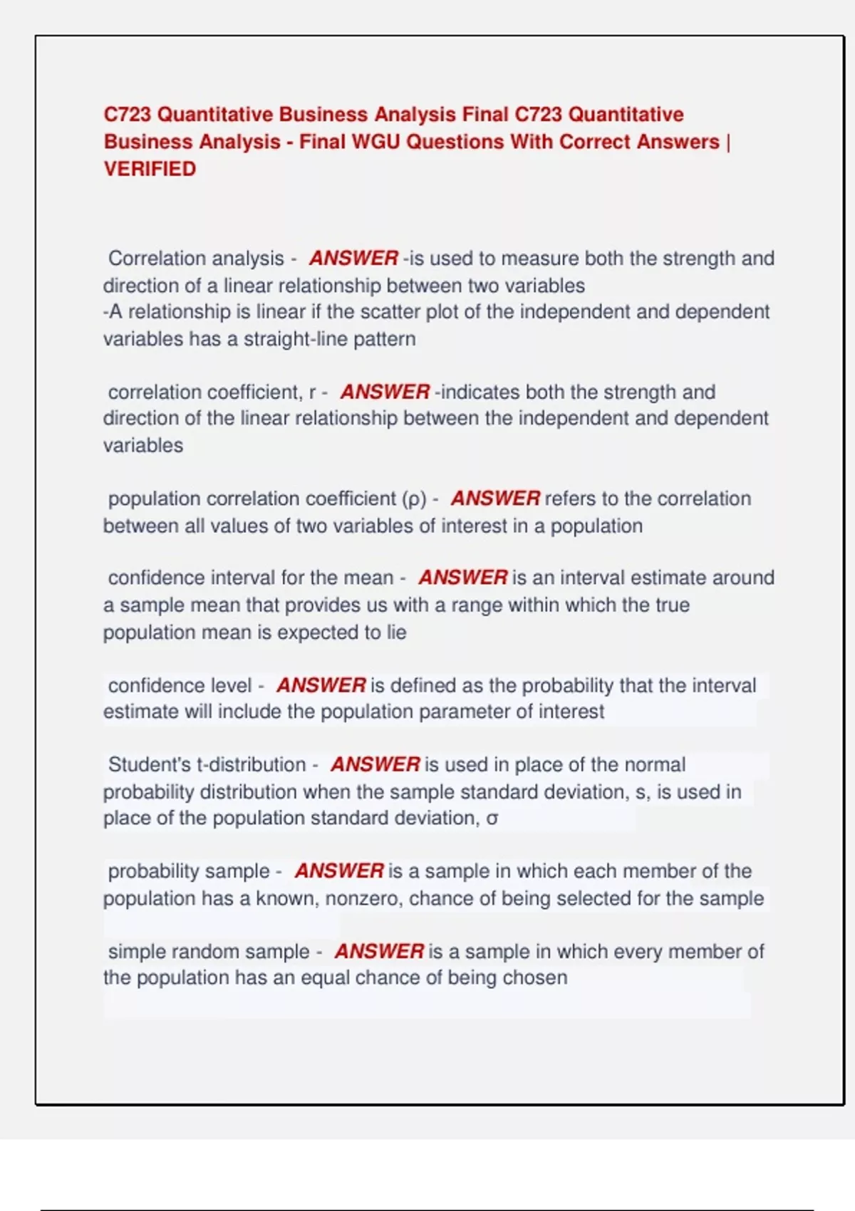 C723 Quantitative Business Analysis Final C723 Quantitative Business Analysis - Final WGU Questions With Correct Answers | VERIFIED