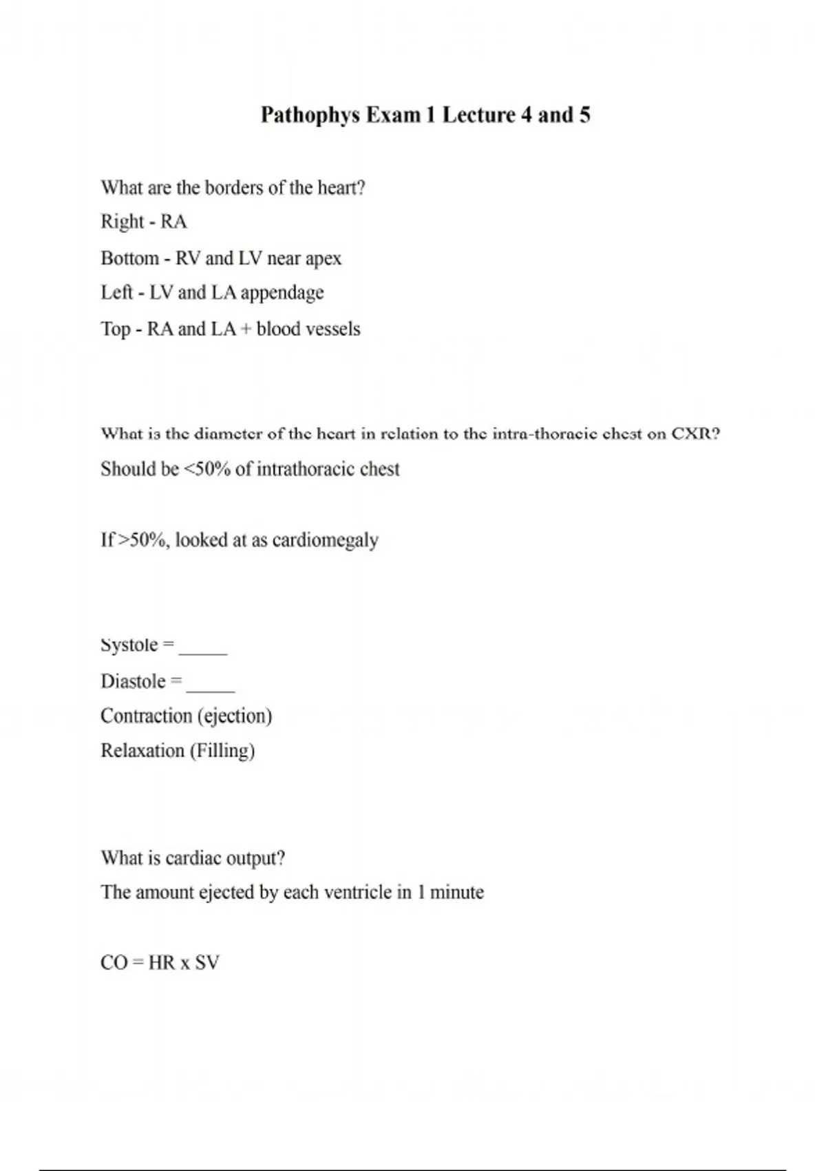 What is the typical cardiac output at rest? About 4 to 6 L/min at rest. It matches the demand of the body, as demand goes up (exercising) CO goes up 5-6 x more What is cardiac reserve? Cardiac reserve is the difference between a person's maximum and resting cardiac output. Increases with fitness, decreases with disease (can decrease to 0 in some disease states) What are the three variables that govern stroke volume? Preload (I.e. end diastolic volume, ~120 mL) Contractility Afterload (resistance (HTN, aortic stenosis))