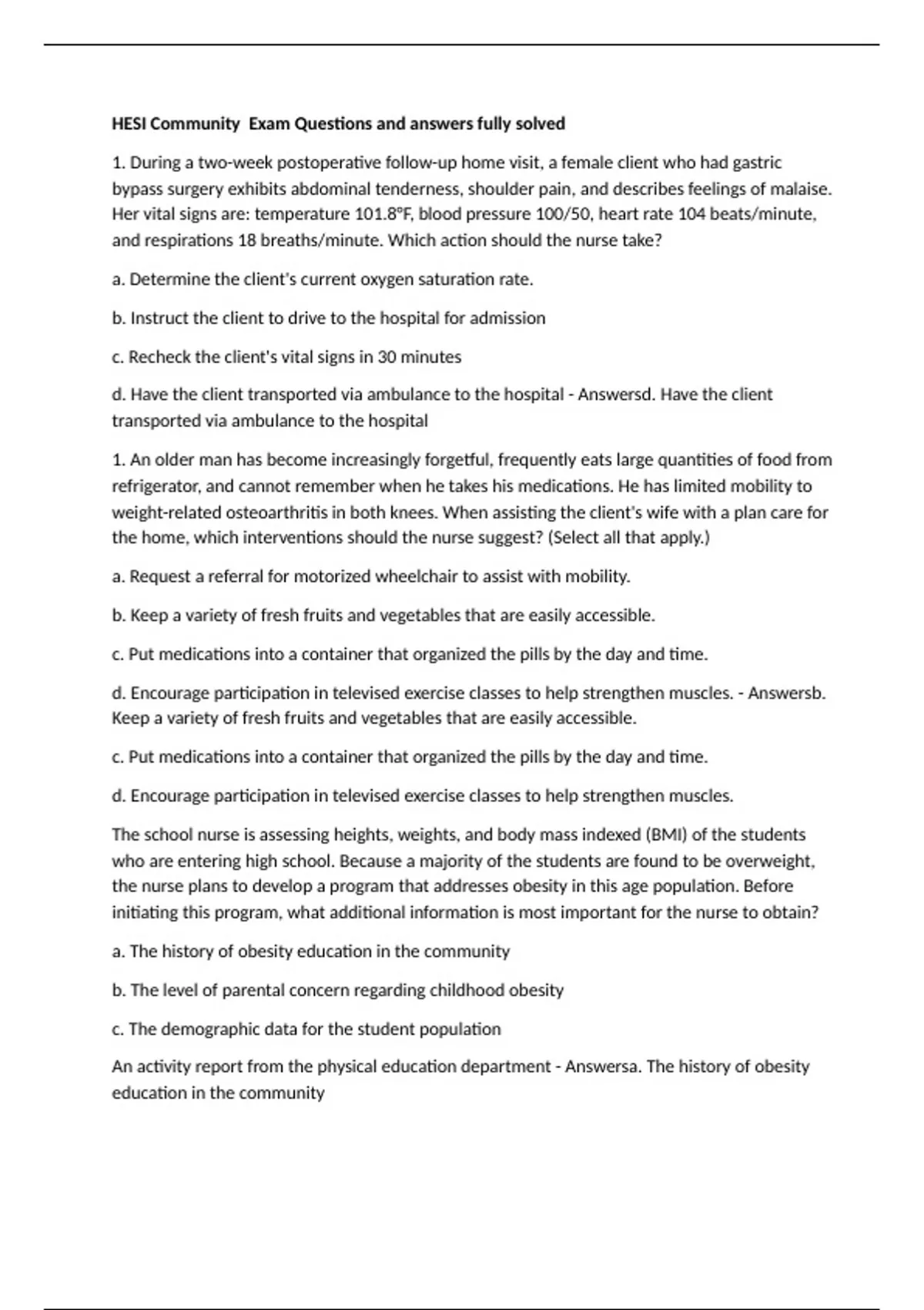 HESI Community Exam Questions and answers fully solved 1. During a two-week postoperative follow-up home visit, a female client who had gastric bypass surgery exhibits abdominal tenderness, shoulder pain, and describes feelings of malaise. Her vital signs are: temperature 101.8°F, blood pressure 100/50, heart rate 104 beats/minute, and respirations 18 breaths/minute. Which action should the nurse take? a. Determine the client's current oxygen saturation rate. b. Instruct the client to drive to the hospital for admission c. Recheck the client's vital signs in 30 minutes d. Have the client transported via ambulance to the hospital - Answersd. Have the client transported via ambulance to the hospital 1. An older man has become increasingly forgetful, frequently eats large quantities of food from refrigerator, and cannot remember when he takes his medications. He has limited mobility to weight-related osteoarthritis in both knees. When assisting the client's wife with a plan care for the home, which interventions should the nurse suggest? (Select all that apply.) a. Request a referral for motorized wheelchair to assist with mobility. b. Keep a variety of fresh fruits and vegetables that are easily accessible. c. Put medications into a container that organized the pills by the day and time. d. Encourage participation in televised exercise classes to help strengthen muscles. - Answersb. Keep a variety of fresh fruits and vegetables that are easily accessible. c. Put medications into a container that organized the pills by the day and time. d. Encourage participation in televised exercise classes to help strengthen muscles. The school nurse is assessing heights, weights, and body mass indexed (BMI) of the students who are entering high school. Because a majority of the students are found to be overweight, the nurse plans to develop a program that addresses obesity in this age population. Before initiating this program, what additional information is most important for the nurse to obtain? a. The history of obesity education in the community b. The level of parental concern regarding childhood obesity c. The demographic data for the student population An activity report from the physical education department - Answersa. The history of obesity education in the community The epidemiological triad can be used to frame strategies for the prevention of farm machinery injuries. Which action should the nurse take to focus on the agent? a. Teach farm workers not to smoke around farm equipment b. Work with legislators to mandate safe tractor design c. Translate written vehicle instructions into picture format d. Provide rehabilitation services to injured farm hands - AnswersWork with legislators to mandate safe tractor design 1. The public health nurse is creating a plan to increase state funding for a local health clinic. Which strategy is likely to be most effective in obtaining funding for the clinic? a. Run the health clinic economically and advertise the services the clinic provides b. Organize concerned citizens to write letters and telephone state representatives c. Described to the media the valuable services provided by the community clinic d. Engage a professional lobbyist to persuade Congress of the local clinic's value - Answersd. Engage a professional lobbyist to persuade Congress of the local clinic's value The nurse is documenting the medical history of a young adult male client who was recently diagnosed with Type 1 diabetes mellitus (DM). He smokes 2 packs of cigarettes daily and his father died of a heart attack at the age of 45. Which annual screening is most important for the nurse include? a. Peripheral neuropathy b. Renal insufficiency c. Retinography d. Hyperlipidemia - Answersd. Hyperlipidemia The nurse provides teaching to a group of evacuees in a mass casualty center after a natural flooding disaster. Which information should the nurse including in the teaching plan? (Select all that apply.) a. Wash all fruits and vegetables thoroughly in running tap water. b. Identify all sexual contacts since the evacuation process c. Take all doses of prophylactic prescriptions for diarrhea d. Clean hands using soap, clean water, or waterless antibacterial solutions E. Drink only boiled water or bottled oral rehydration solutions - Answersc. Take all doses of prophylactic prescriptions for diarrhea d. Clean hands using soap, clean water, or waterless antibacterial solutions E. Drink only boiled water or bottled oral rehydration solutions A nurse is planning a nutrition class for a group of senior citizens at a community center and wants to emphasize the amount and types of fat in some foods versus others. What is the best teaching method for the nurse to use? a. Display posters with foods and tell seniors about fat content b. Determine foods most often eaten by this group and discuss the nutritional panel of each product c. Show a movie about cooking with foods that are low in fat but delicious d. Ask each senior to bring a food for others to taste, then estimate the fat contained in these foods - Answersb. Determine foods most often eaten by this group and discuss the nutritional panel of each product An adult male who has diabetes is laid off from his job of 15 years where he had health care benefits. By law, he is provided with Consolidated Omnibus Budget Reconciliation Act (COBRA) benefits. What is likely to be his greatest concern in planning for his health care during the next year? a. Paying for his health care b. Obtaining quality medical care c. Selecting a primary care provider d. Having required lab work completed - Answersa. Paying for his health care 1. A prescription for discharge is written for an elderly female client who has asked to be discharged to her home. The client lives alone and is able to walk 10 to 15 feet with assistance. What action should the nurse implement first? a. Review the home medication schedule with the client and family b. Arrange for a bedside commode