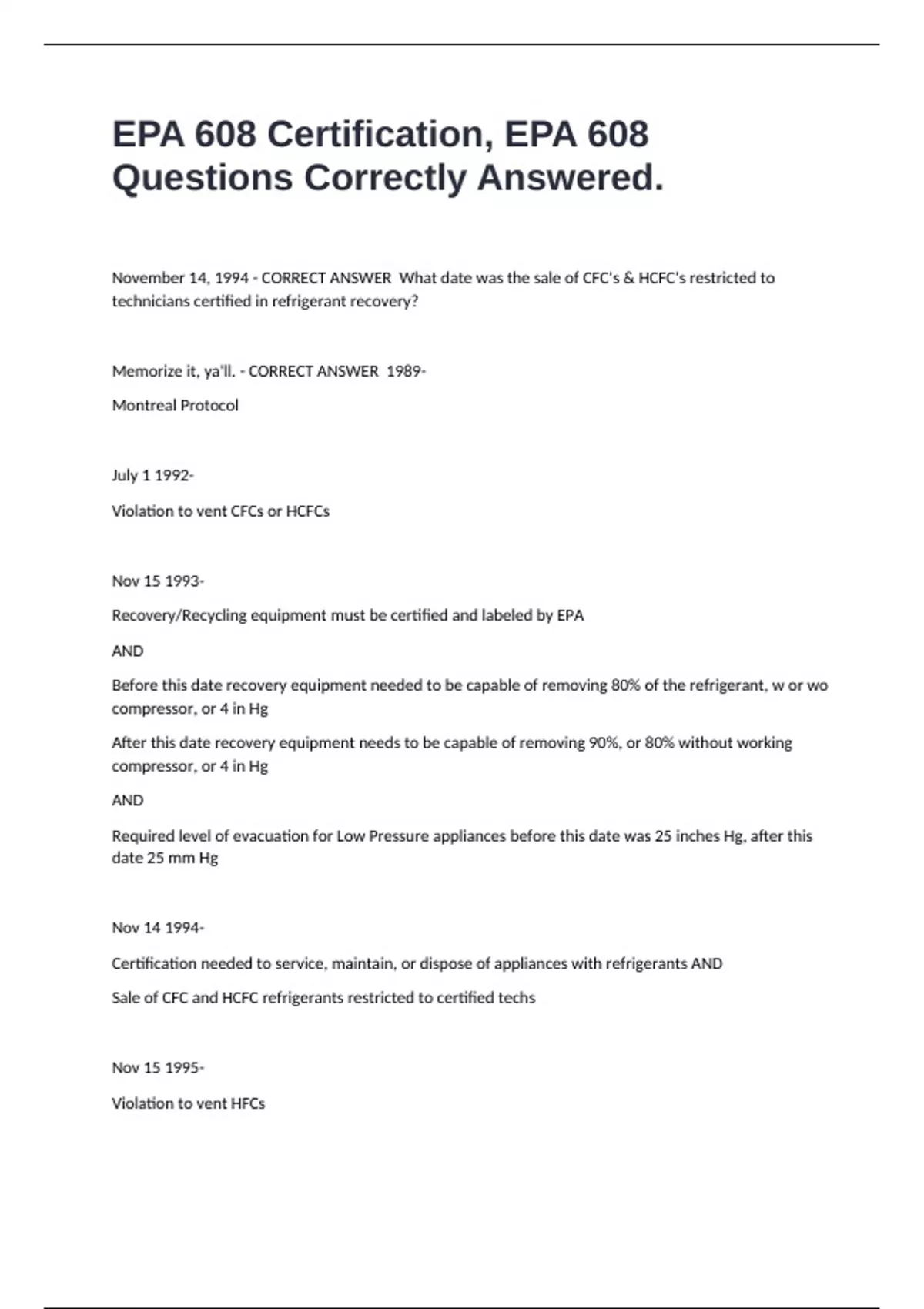 EPA 608 Certification, EPA 608 Questions Correctly Answered. November 14, 1994 - CORRECT ANSWER What date was the sale of CFC's & HCFC's restricted to technicians certified in refrigerant recovery? Memorize it, ya'll. - CORRECT ANSWER 1989- Montreal Protocol July 1 1992- Violation to vent CFCs or HCFCs Nov 15 1993- Recovery/Recycling equipment must be certified and labeled by EPA AND Before this date recovery equipment needed to be capable of removing 80% of the refrigerant, w or wo compressor, or 4 in Hg After this date recovery equipment needs to be capable of removing 90%, or 80% without working compressor, or 4 in Hg AND Required level of evacuation for Low Pressure appliances before this date was 25 inches Hg, after this date 25 mm Hg Nov 14 1994- Certification needed to service, maintain, or dispose of appliances with refrigerants AND Sale of CFC and HCFC refrigerants restricted to certified techs Nov 15 1995- Violation to vent HFCs Dec 31 1995- CFCs no longer produced 15% - CORRECT ANSWER Comfort cooling appliances containing more than 50 lbs of refrigerant must be repaired when the annual leak rate exceeds _____% 35% - CORRECT ANSWER Commercial and Industrial process refrigeration containing ore than 50 lbs of refrigerant must be repaired when the annual leak rate exceeds _____% 0 0 4 10 4 10 4 15 0 0 - CORRECT ANSWER Required Recovery Levels for Type II appliances, before and after 11/15/93: HCFC22 less than 200 lbs = B4-0 After-0 HCFC22 more than 200 lbs= B4-4 After-10 NonHCFC22 less than 200 lbs= B4-4 After 10 NonHCFC22 more than 200 lbs= B4 4 After 15 Very high pressure appliances= B4-0 After-0 Recover all refrigerants. - CORRECT ANSWER Section 608 of the Federal Clean Air Act requires technicians to what? The earth's stratosphere. - CORRECT ANSWER The objective of the Clean Air Act is to protect what? HydroFlouroCarbon's - CORRECT ANSWER HFC's ChloroFluoroCarbon's - CORRECT ANSWER CFC's Ozone Depletion Potential - CORRECT ANSWER ODP The Montreal Protocol. - CORRECT ANSWER Which international treaty agreement was the basis for Section 608? 1.Crop losses 2.Increases in eye diseases 3.Skin Cancer 4.Reduced marine life 5.Deforestation 6.Increased ground level ozone - CORRECT ANSWER Depletion of the ozone in the stratosphere is known to cause what 6 things? These atoms attack Ozone Molecules causing the formation of Chlorine Monoxide (CLO), after colliding with another Ozone Molecule, causes 2 Oxygen (O2) molecules to be made & leaving an atom of chlorine to act as "Free Agent" starting the process over until 100,000 molecules of Ozone are destroyed by just one atom of chloride. - CORRECT ANSWER What happens when CFC or HCFC molecules get in the stratosphere & free atoms of Chlorine are set free?
