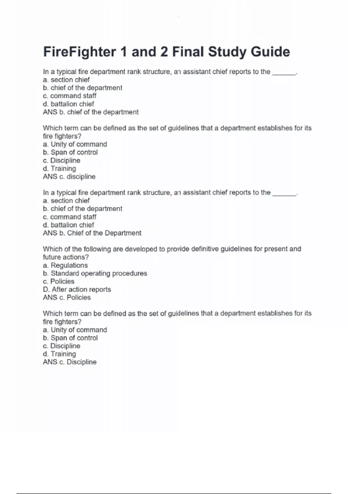 FireFighter 1 and 2 Final Study Guide In a typical fire department rank structure, an assistant chief reports to the ______. a. section chief b. chief of the department c. command staff d. battalion chief ANS b. chief of the department Which term can be defined as the set of guidelines that a department establishes for its fire fighters? a. Unity of command b. Span of control c. Discipline d. Training ANS c. discipline In a typical fire department rank structure, an assistant chief reports to the ______. a. section chief b. chief of the department c. command staff d. battalion chief ANS b. Chief of the Department Which of the following are developed to provide definitive guidelines for present and future actions? a. Regulations b. Standard operating procedures c. Policies D. After action reports ANS c. Policies Which term can be defined as the set of guidelines that a department establishes for its fire fighters? a. Unity of command b. Span of control c. Discipline d. Training ANS c. Discipline