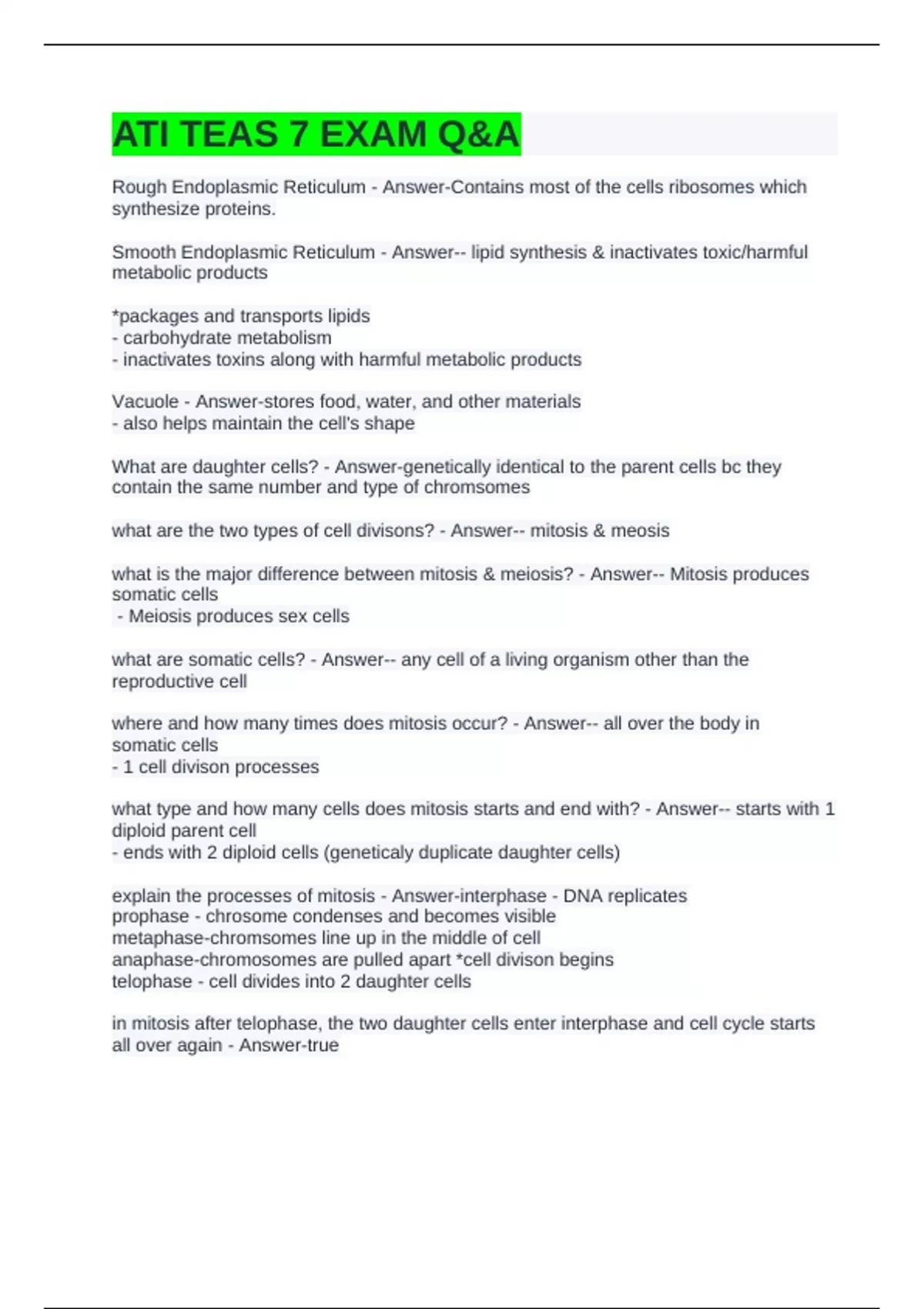 ATI TEAS 7 EXAM Q&A Rough Endoplasmic Reticulum - Answer-Contains most of the cells ribosomes which synthesize proteins. Smooth Endoplasmic Reticulum - Answer-- lipid synthesis & inactivates toxic/harmful metabolic products *packages and transports lipids - carbohydrate metabolism - inactivates toxins along with harmful metabolic products Vacuole - Answer-stores food, water, and other materials - also helps maintain the cell's shape What are daughter cells? - Answer-genetically identical to the parent cells bc they contain the same number and type of chromsomes what are the two types of cell divisons? - Answer-- mitosis & meosis what is the major difference between mitosis & meiosis? - Answer-- Mitosis produces somatic cells - Meiosis produces sex cells what are somatic cells? - Answer-- any cell of a living organism other than the reproductive cell where and how many times does mitosis occur? - Answer-- all over the body in somatic cells - 1 cell divison processes what type and how many cells does mitosis starts and end with? - Answer-- starts with 1 diploid parent cell - ends with 2 diploid cells (geneticaly duplicate daughter cells) explain the processes of mitosis - Answer-interphase - DNA replicates prophase - chrosome condenses and becomes visible metaphase-chromsomes line up in the middle of cell anaphase-chromosomes are pulled apart *cell divison begins telophase - cell divides into 2 daughter cells in mitosis after telophase, the two daughter cells enter interphase and cell cycle starts all over again - Answer-true