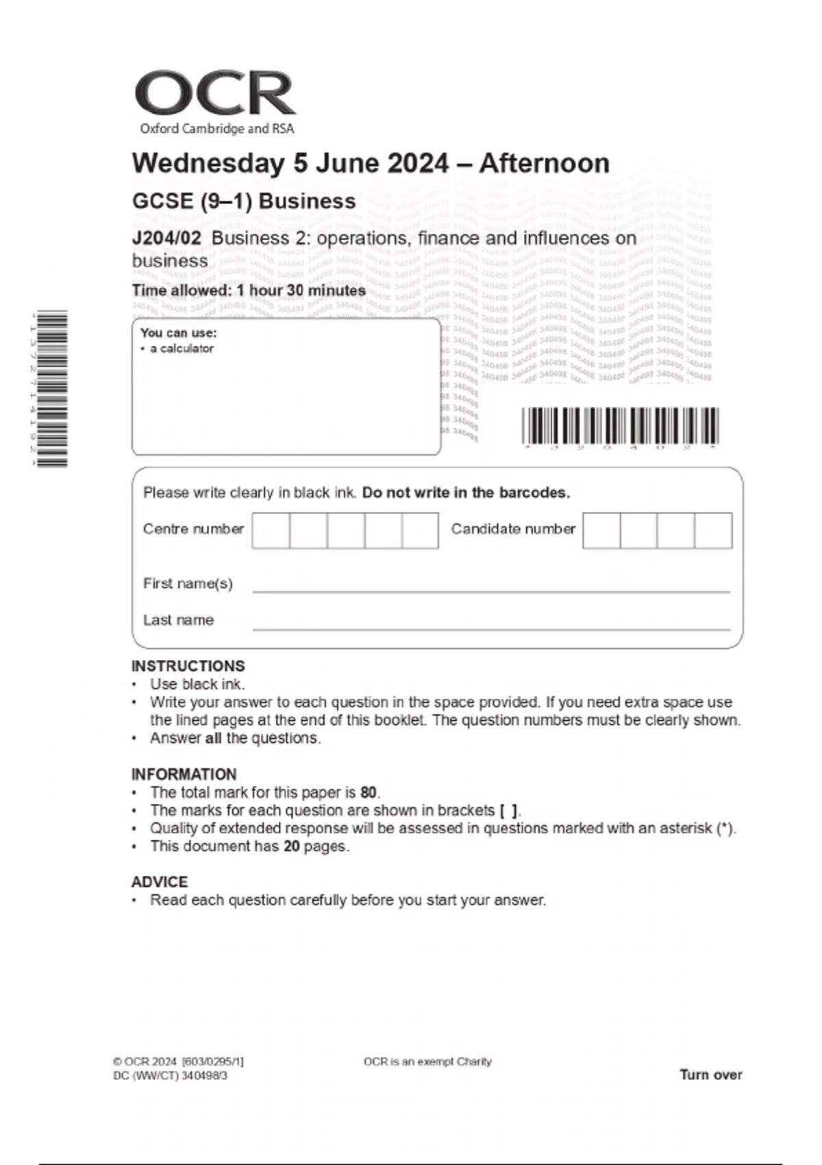 OCR GCSE (9–1) Business J204/02 Business 2: operations, finance and influences on business COMBINED QUESTION PAPER AND MARKING SCHEME