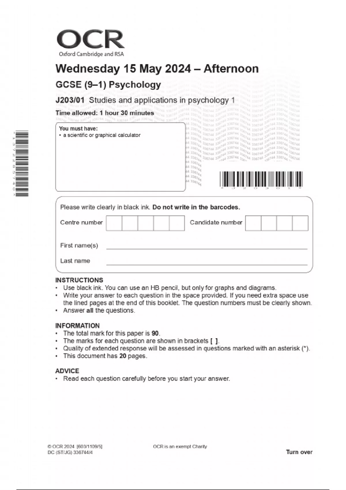 OCR GCSE (9–1) Psychology J203/01 Studies and applications in psychology 1 COMBINED QUESTION PAPER AND MARKING SCHEME