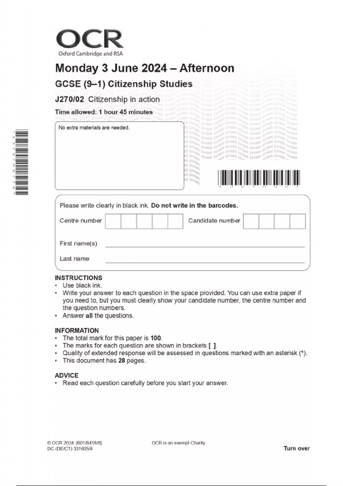 OCR GCSE (9–1) Citizenship Studies J270/02 Citizenship in action COMBINED QUESTION PAPER AND MARKING SCHEME