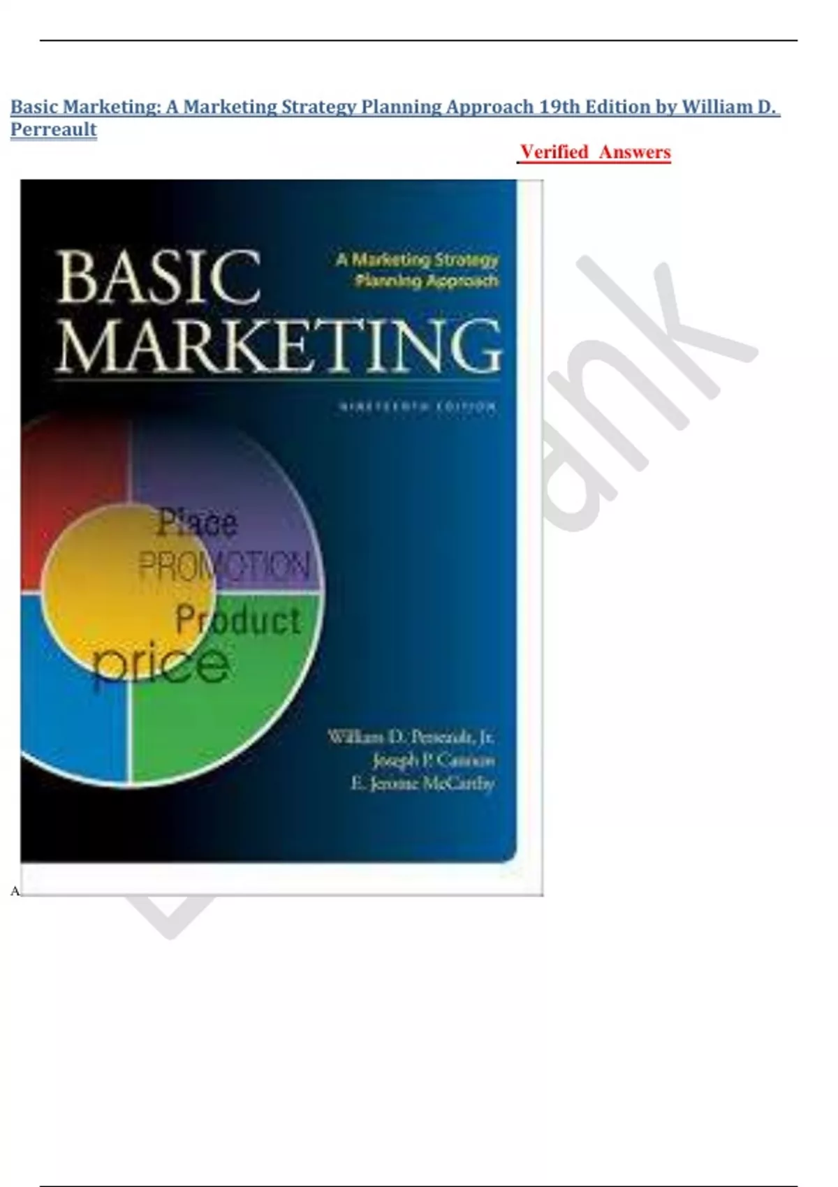 Comprehensive test bank for Basic Marketing: A Marketing Strategy Planning Approach 19th Edition by William D. Perreault, featuring all chapters with verified answers and A+ graded content, fully updated for the most recent edition.