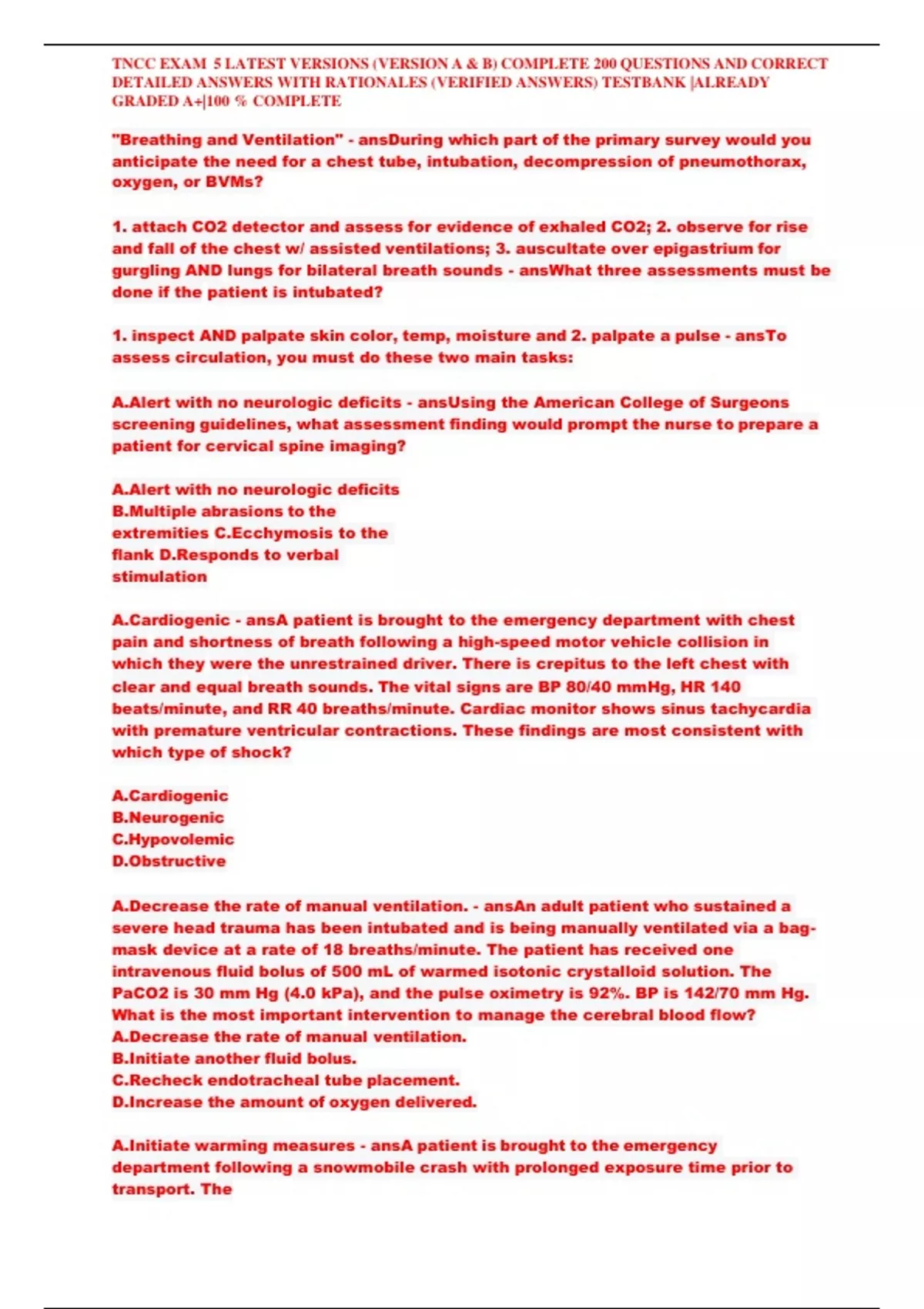 TNCC EXAM 5 LATEST VERSIONS (VERSION A & B) COMPLETE 200 QUESTIONS AND CORRECT