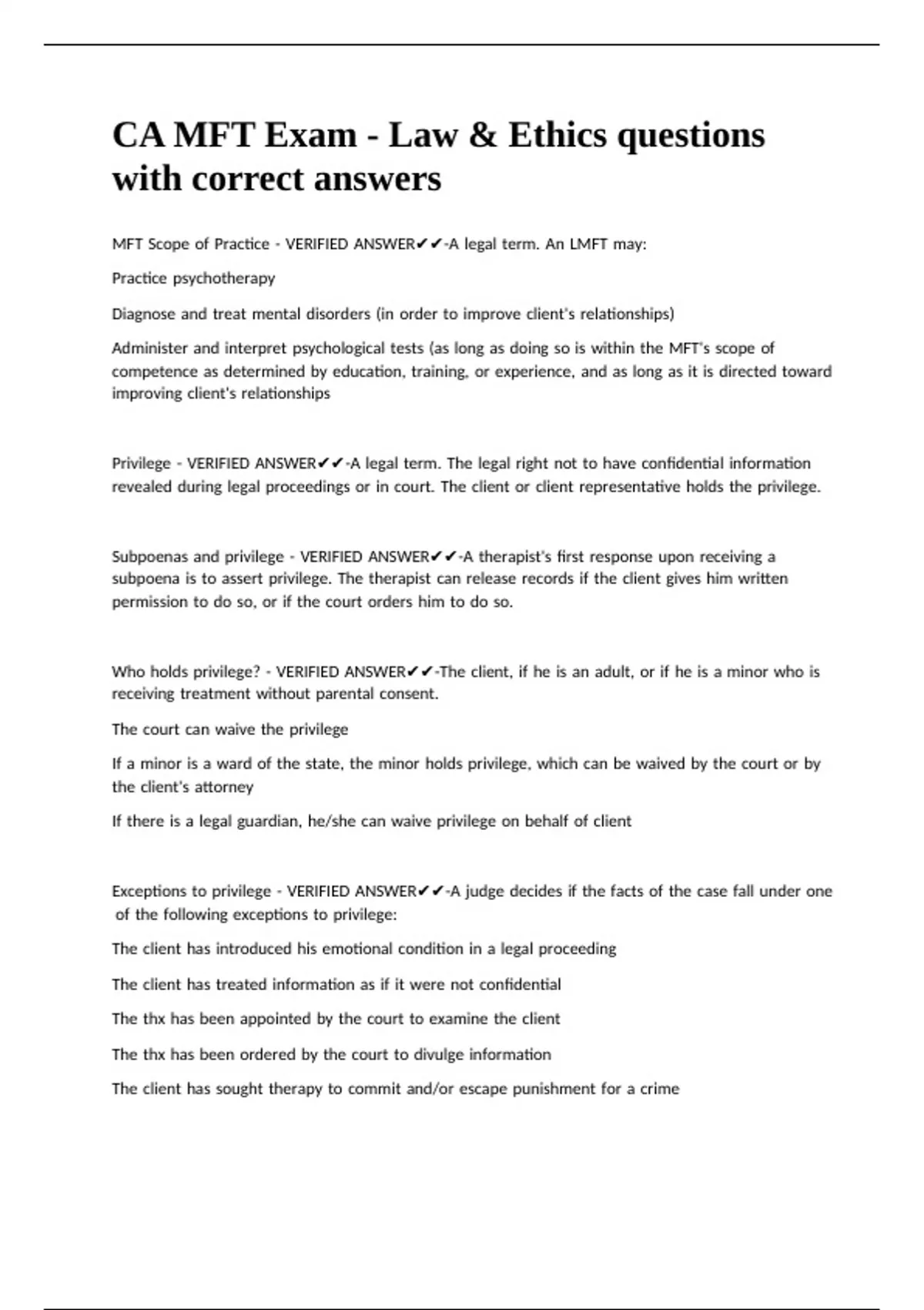 CA MFT Exam - Law & Ethics questions with correct answers.