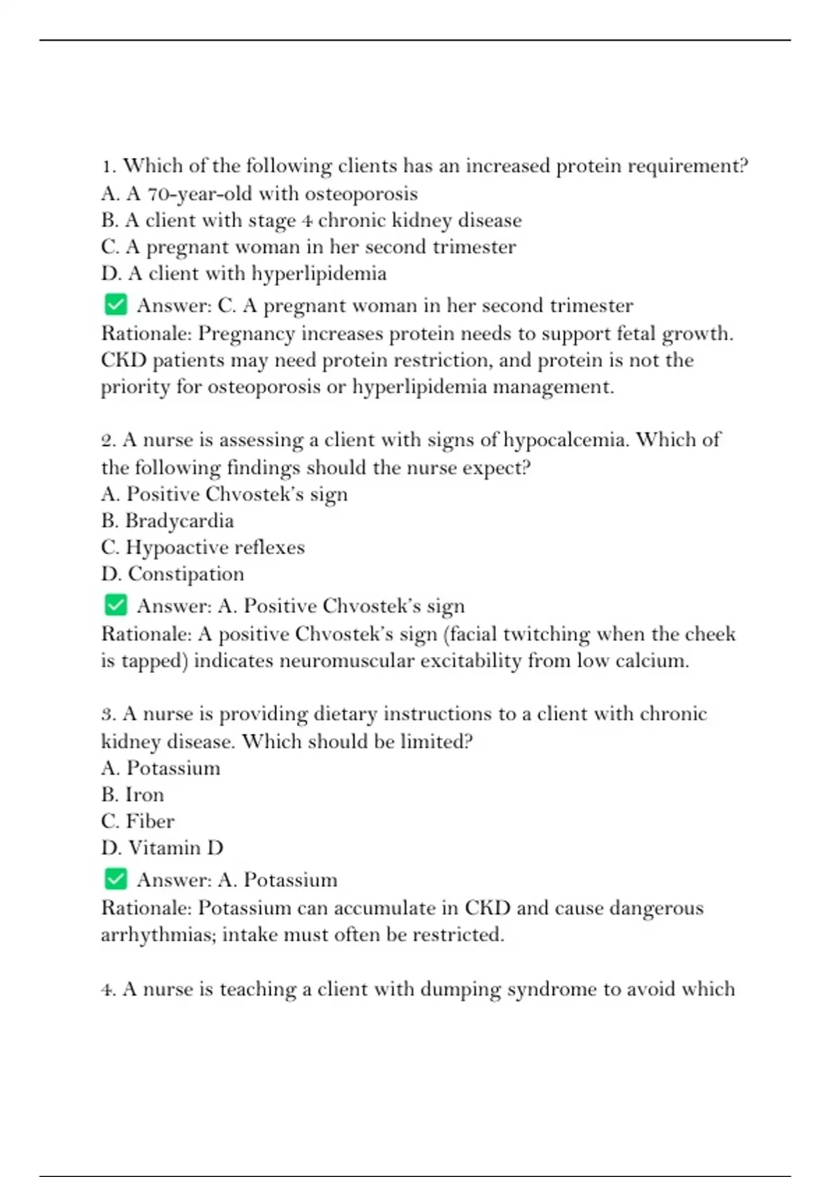 2. A nurse is assessing a client with signs of hypocalcemia. Which of