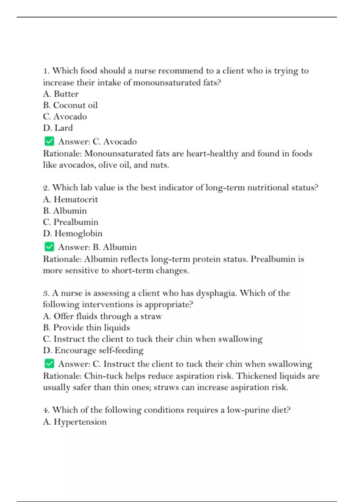 1. Which food should a nurse recommend to a client who is trying to