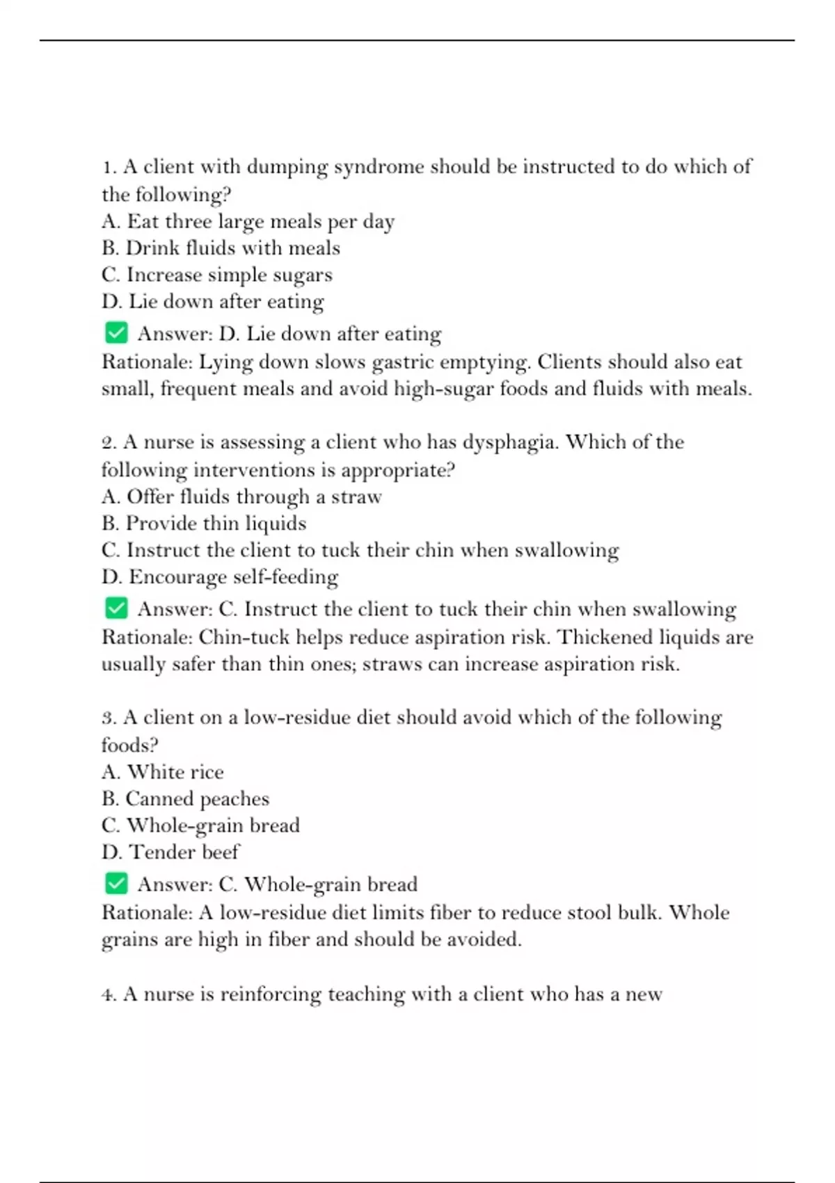 4. A nurse is reinforcing teaching with a client who has a new