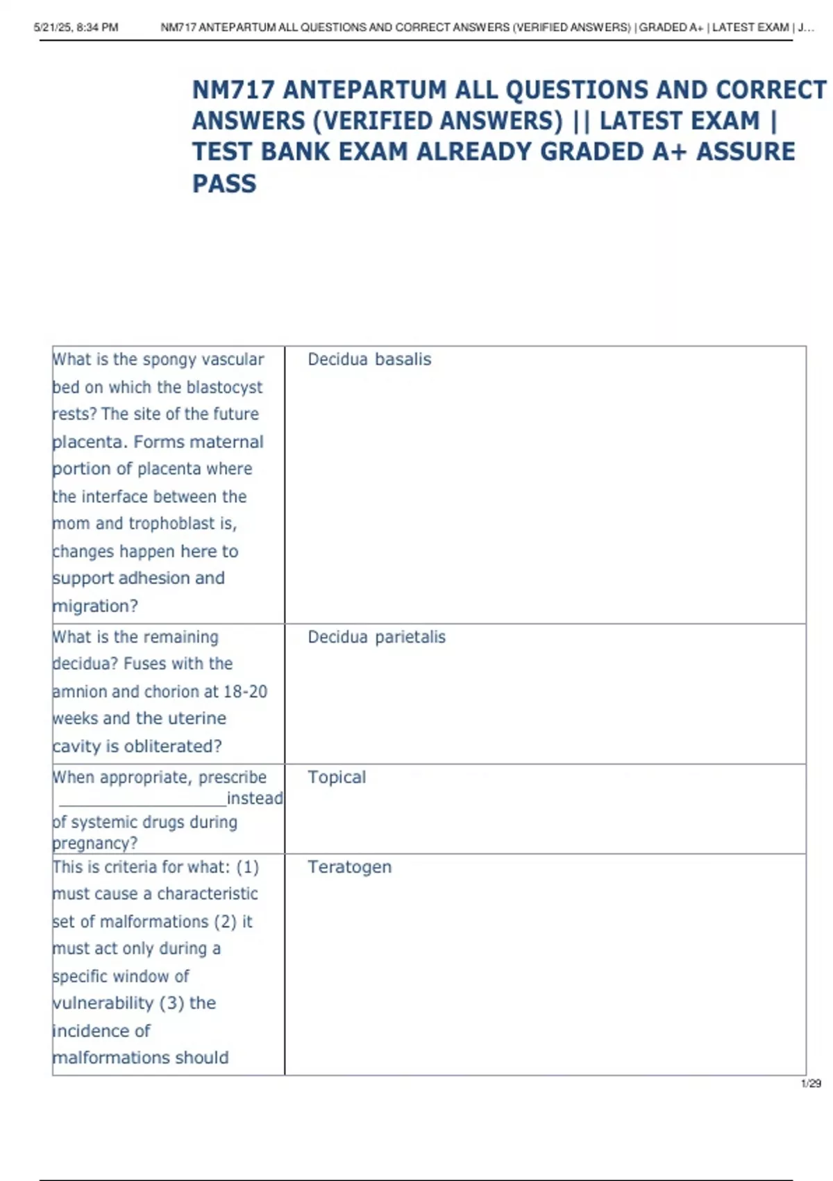 , 5/21/25, 8:34 PM NM717 ANTEPARTUM ALL QUESTIONS AND CORRECT ANSWERS (VERIFIED ANSWERS) | GRADED A+ | LATEST EXAM | J…