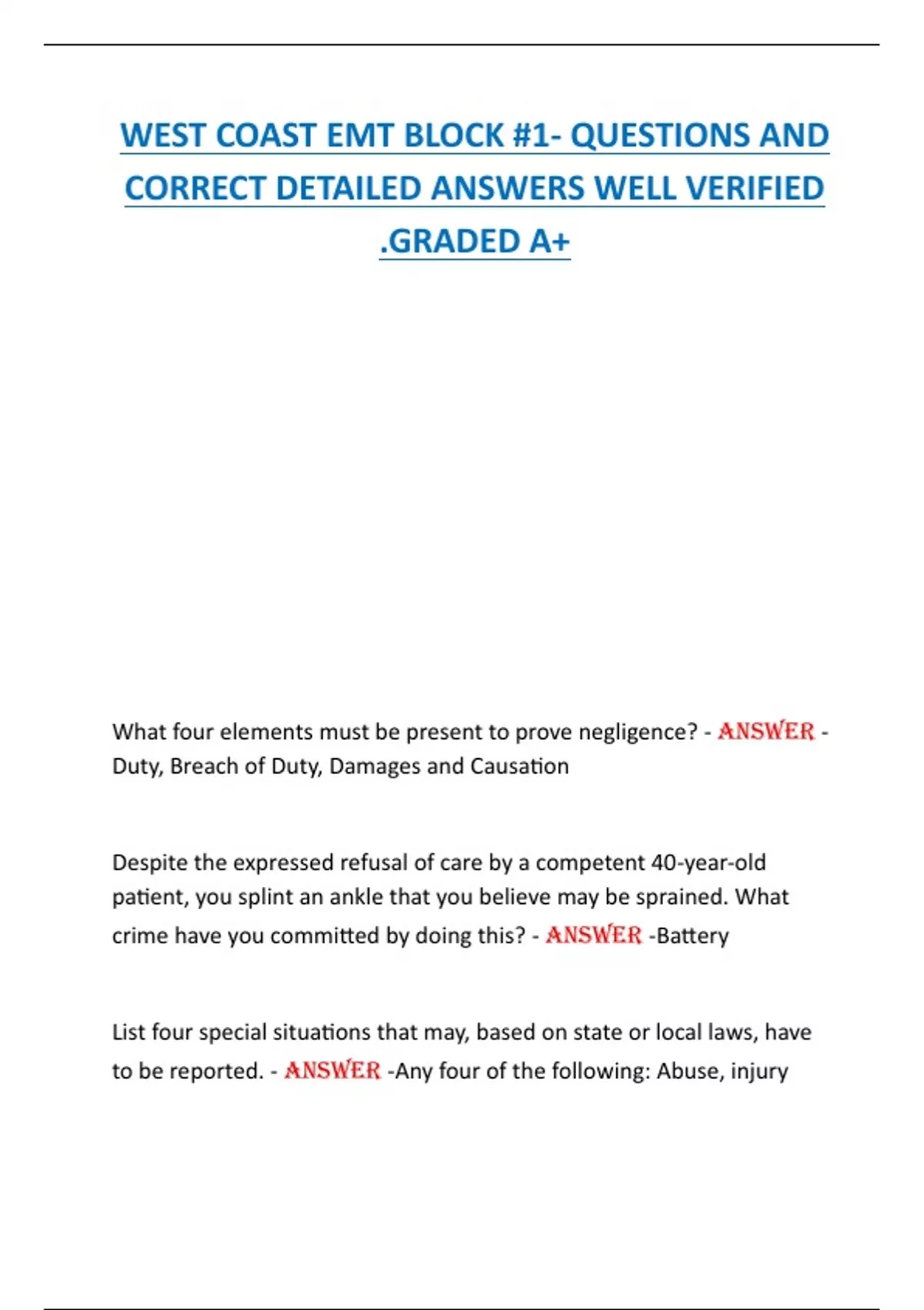 WEST COAST EMT BLOCK #1- QUESTIONS AND CORRECT DETAILED ANSWERS WELL VERIFIED .GRADED A+