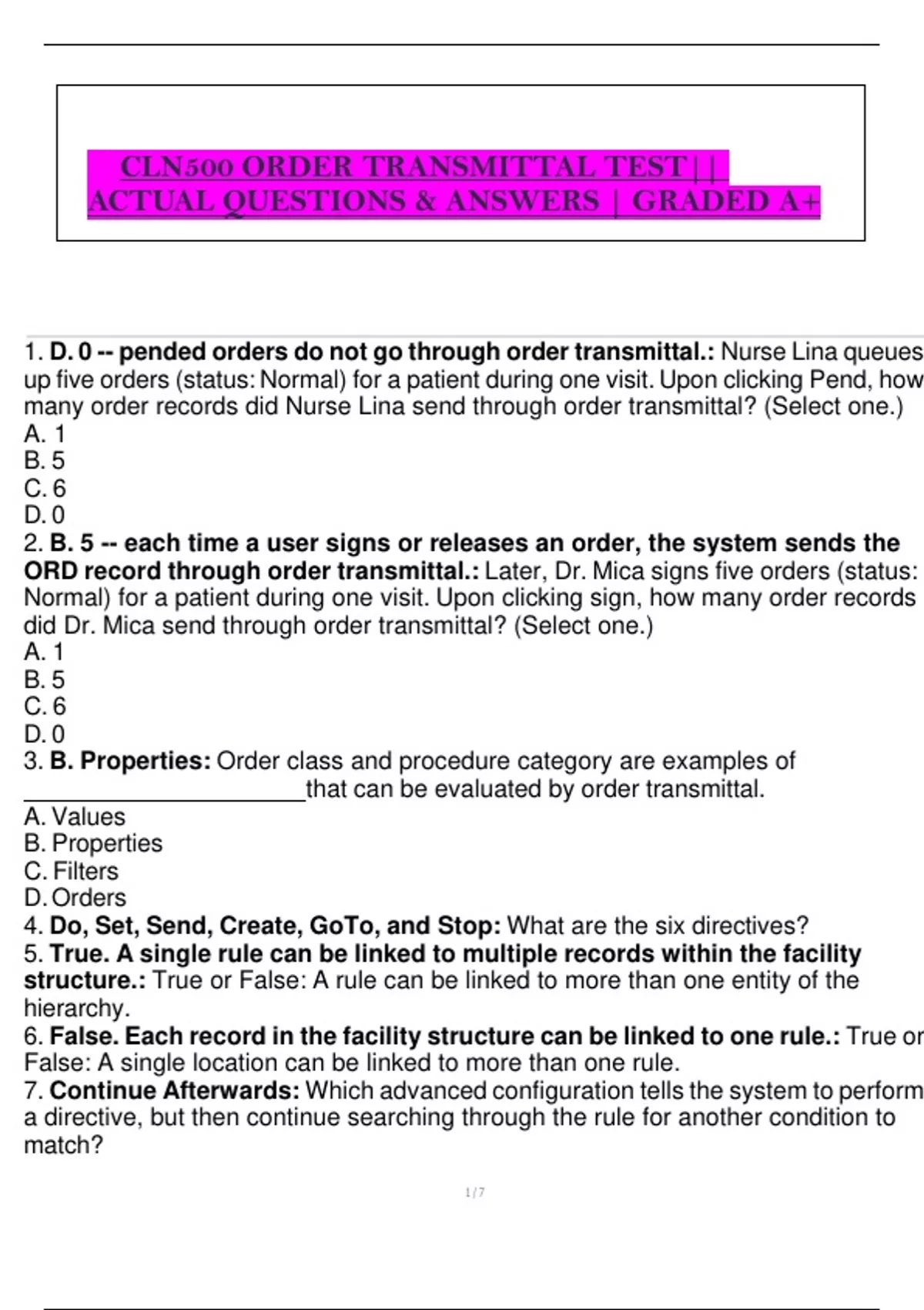 CLN500 ORDER TRANSMITTAL TEST|| ACTUAL QUESTIONS & ANSWERS | GRADED A+ 1. D. 0 -- pended orders do not go through order transmittal.: Nurse Lina queues up five orders (status: Normal) for a patient during one visit. Upon clicking Pend, how many order records did Nurse Lina send through order transmittal? (Select one.) A. 1 B. 5 C. 6 D. 0 2. B. 5 -- each time a user signs or releases an order, the system sends the ORD record through order transmittal.: Later, Dr. Mica signs five orders (status: Normal) for a patient during one visit. Upon clicking sign, how many order records did Dr. Mica send through order transmittal? (Select one.) A. 1 B. 5 C. 6 D. 0 3. B. Properties: Order class and procedure category are examples of that can be evaluated by order transmittal. A. Values B. Properties C. Filters D. Orders 4. Do, Set, Send, Create, GoTo, and Stop: What are the six directives? 5. True. A single rule can be linked to multiple records within the facility structure.: True or False: A rule can be linked to more than one entity of the hierarchy. 6. False. Each record in the facility structure can be linked to one rule.: True or False: A single location can be linked to more than one rule. 7. Continue Afterwards: Which advanced configuration tells the system to perform a directive, but then continue searching through the rule for another condition to match?