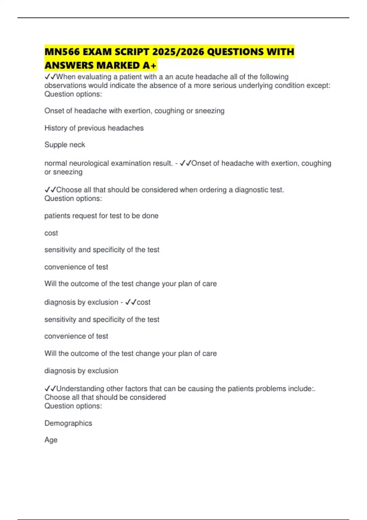 ✔✔When evaluating a patient with a an acute headache all of the following