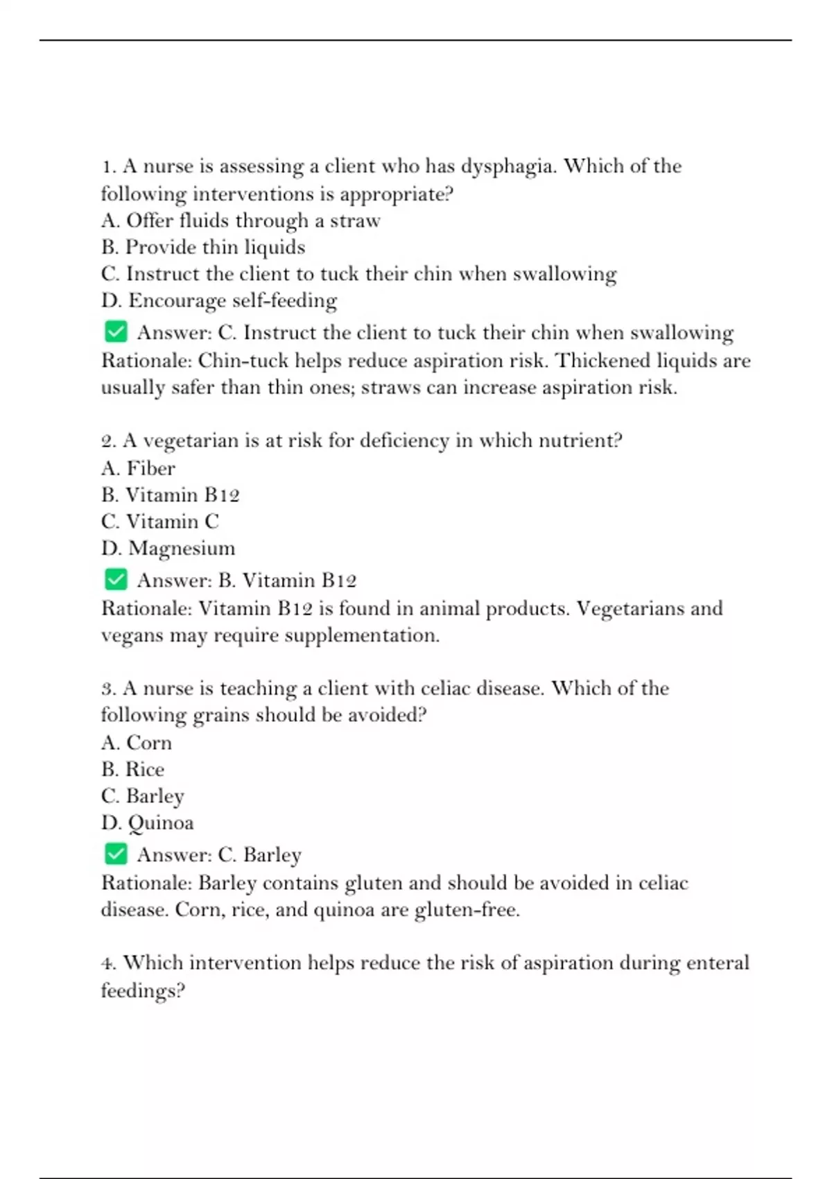 1. A nurse is assessing a client who has dysphagia. Which of the
