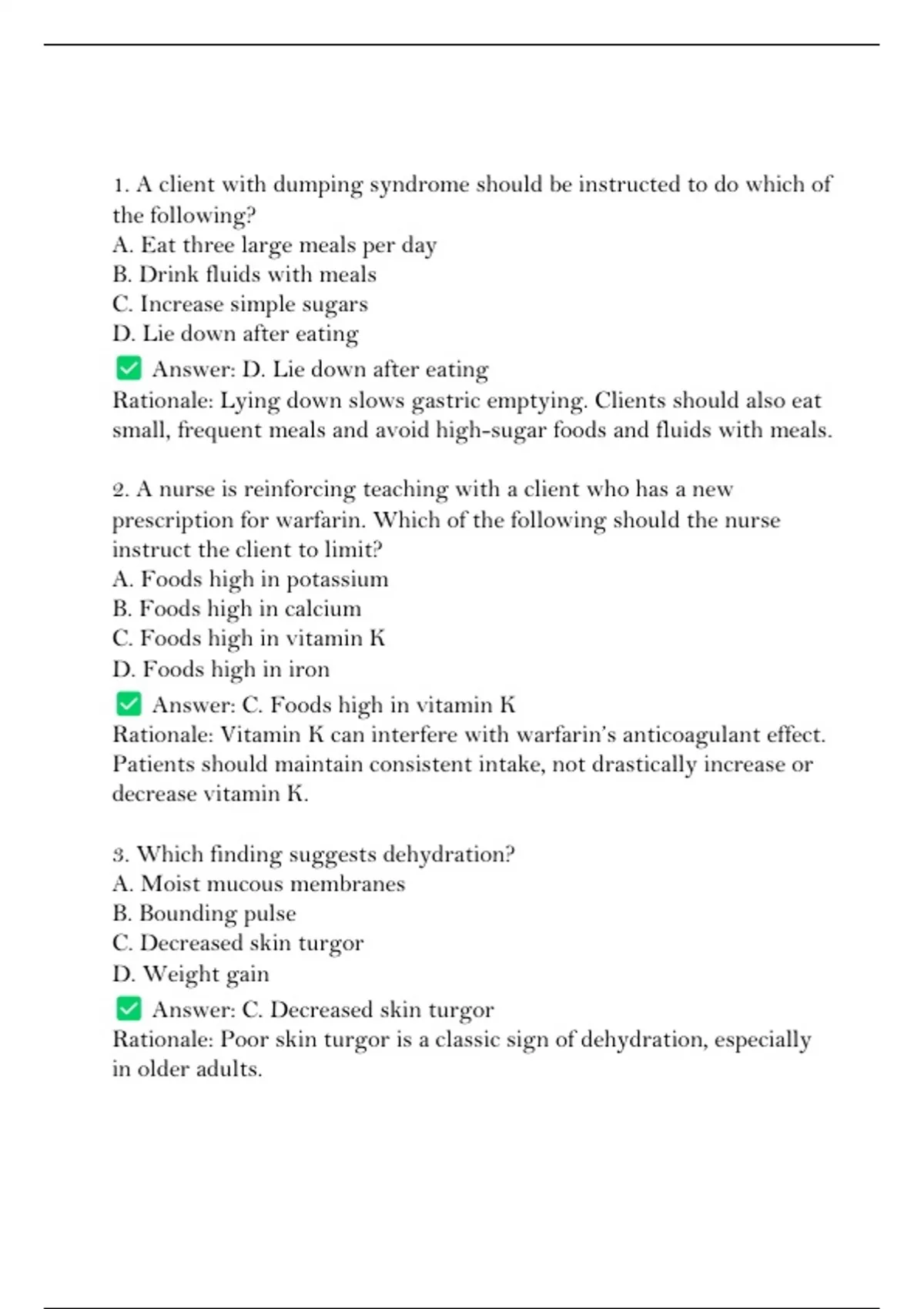Rationale: Lying down slows gastric emptying. Clients should also eat