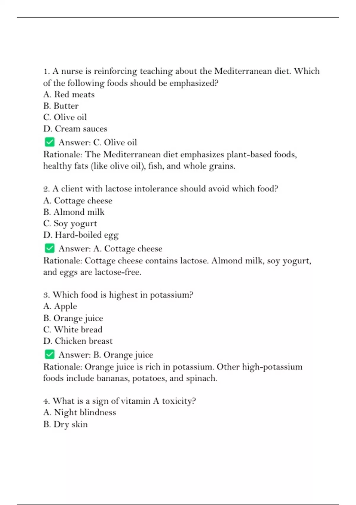 1. A nurse is reinforcing teaching about the Mediterranean diet. Which