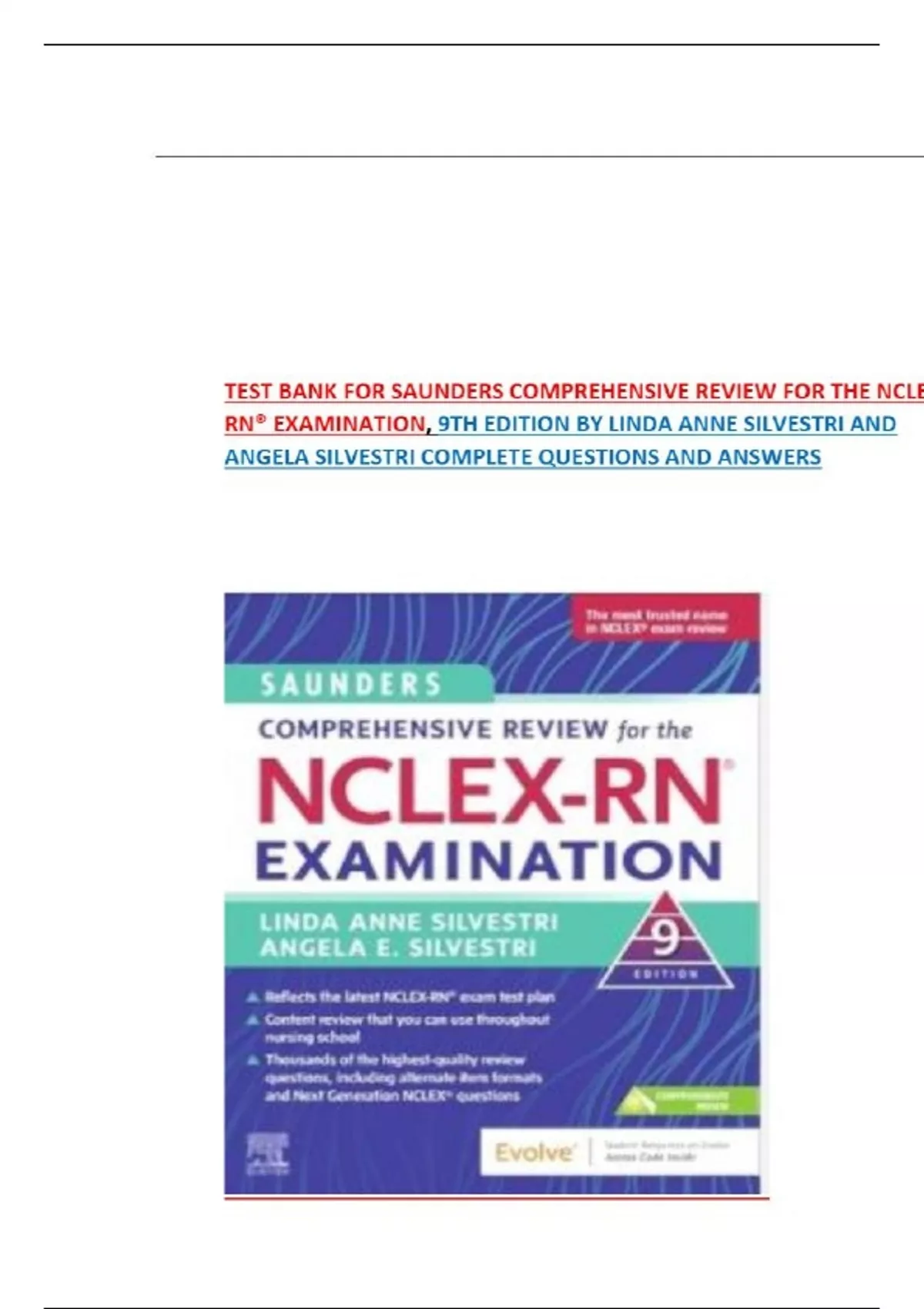 TEST BANK FOR SAUNDERS COMPREHENSIVE REVIEW FOR THE NCLEX-RN® EXAMINATION, 9TH EDITION BY LINDA ANNE SILVESTRI AND ANGELA SILVESTRI COMPLETE QUESTIONS AND ANSWERS