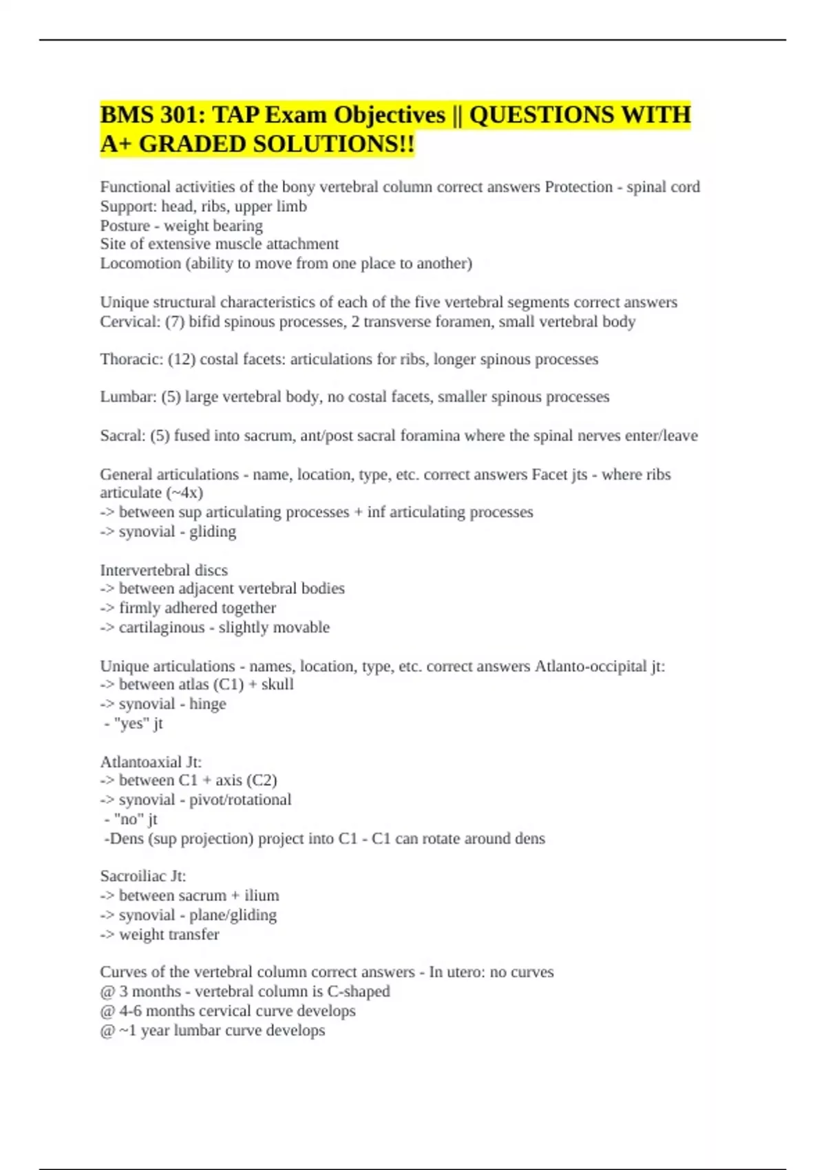 Functional activities of the bony vertebral column correct answers Protection - spinal cord