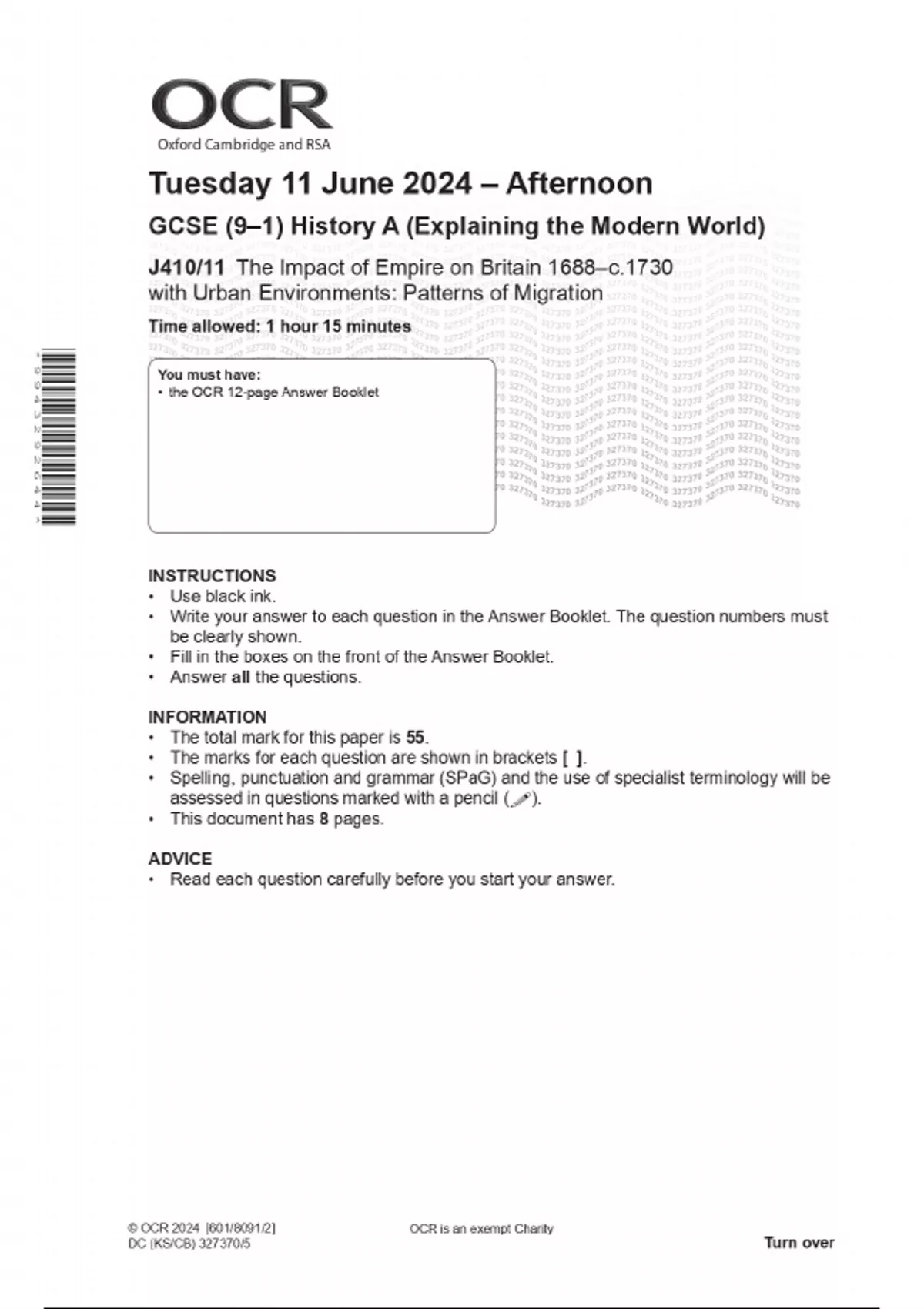 OCR GCSE (9–1) History A (Explaining the Modern World) J410/11 The Impact of Empire on Britain 1688–c.1730 with Urban Environments: Patterns of Migration COMBINED QUESTION PAPER AND MARKING SCHEME