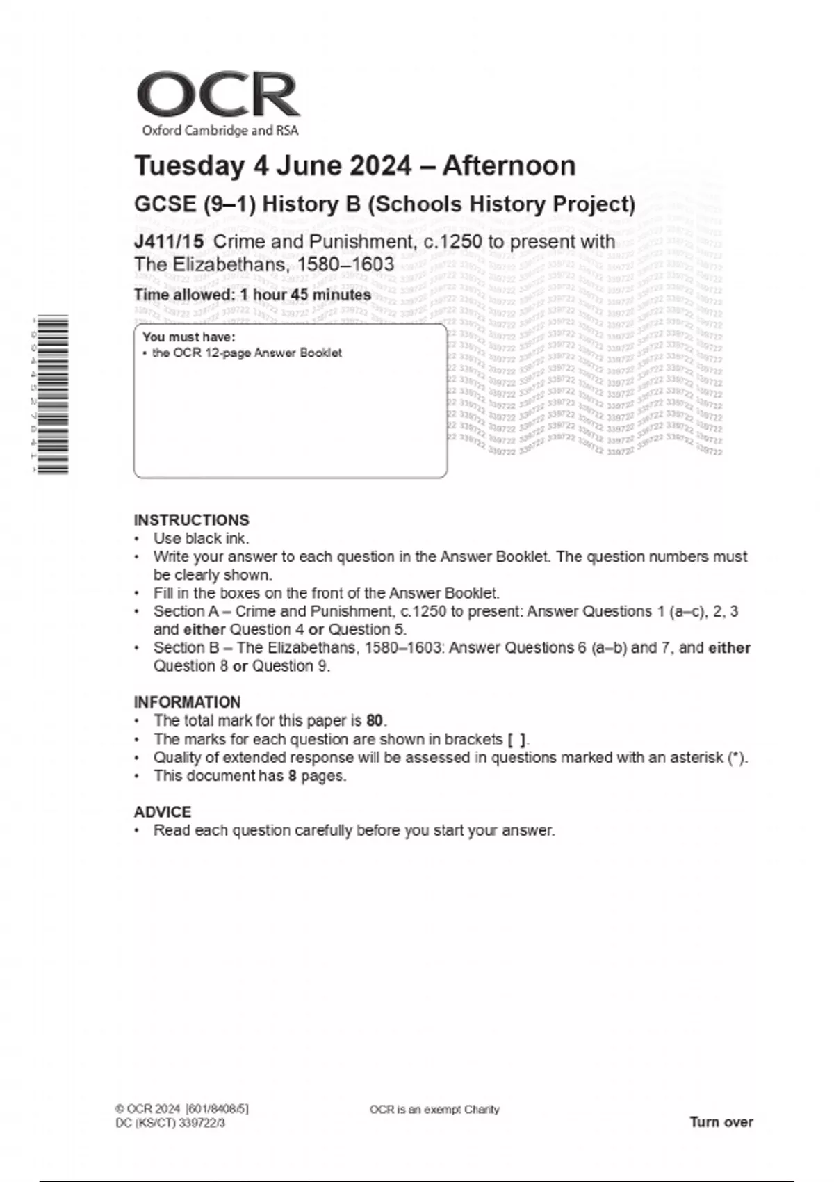 OCR GCSE (9–1) History B (Schools History Project) J411/15 Crime and Punishment, c.1250 to present with The Elizabethans, 1580–1603 COMBINED QUESTION PAPER AND MARKING SCHEME