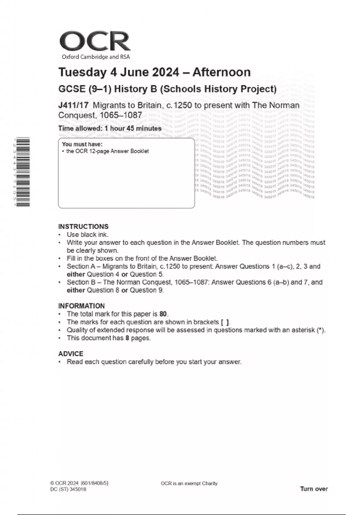 OCR GCSE (9–1) History B (Schools History Project) J411/17 Migrants to Britain, c.1250 to present with The Norman Conquest, 1065–1087 COMBINED QUESTION PAPER AND MARKING SCHEME