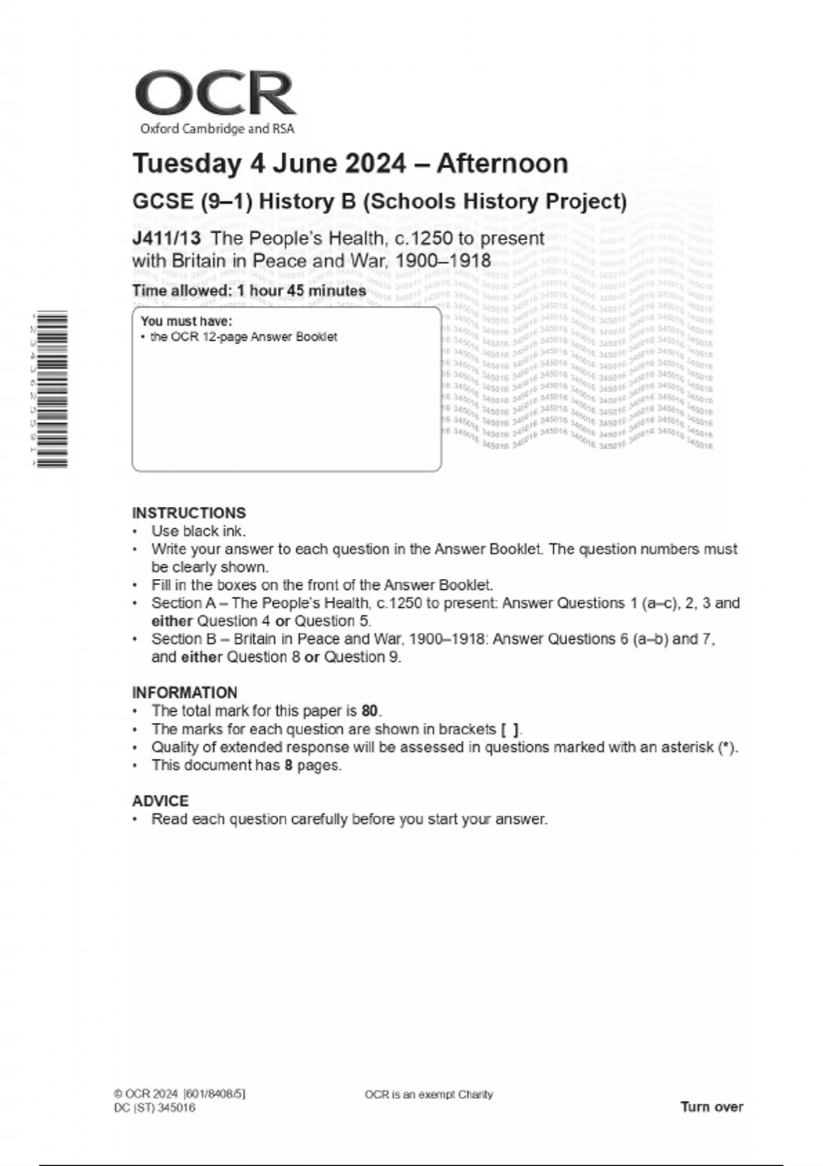 OCR GCSE (9–1) History B (Schools History Project) J411/13 The People’s Health, c.1250 to present with Britain in Peace and War, 1900–1918 COMBINED QUESTION PAPER AND MARKING SCHEME
