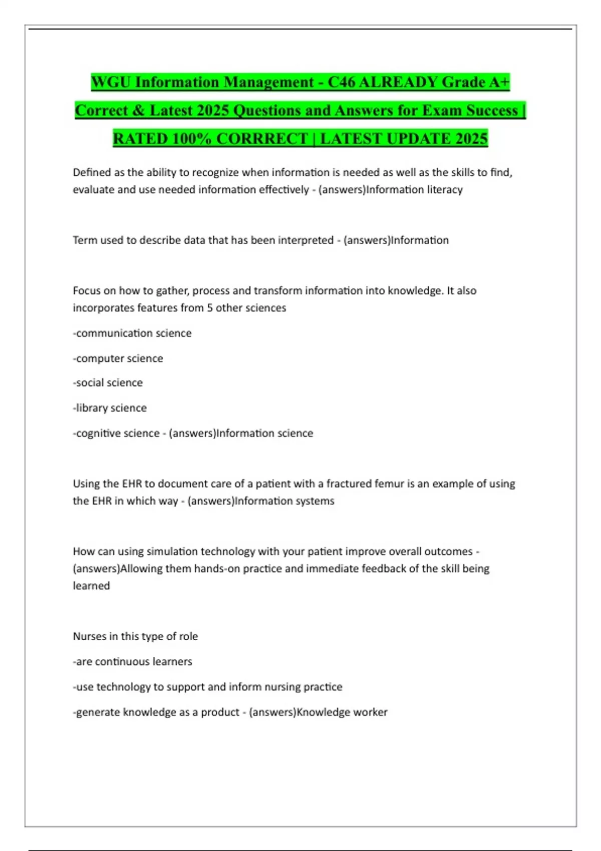 This document contains a comprehensive set of the latest and correct questions and answers for the WGU Information Management - C468 exam in 2025. Covering key topics like data governance, database management, and information systems, this Grade A+ resource helps you prepare efficiently and confidently for top exam performance.