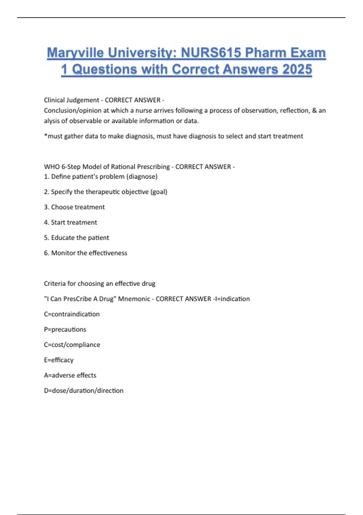 Maryville University: NURS615 Pharm Exam