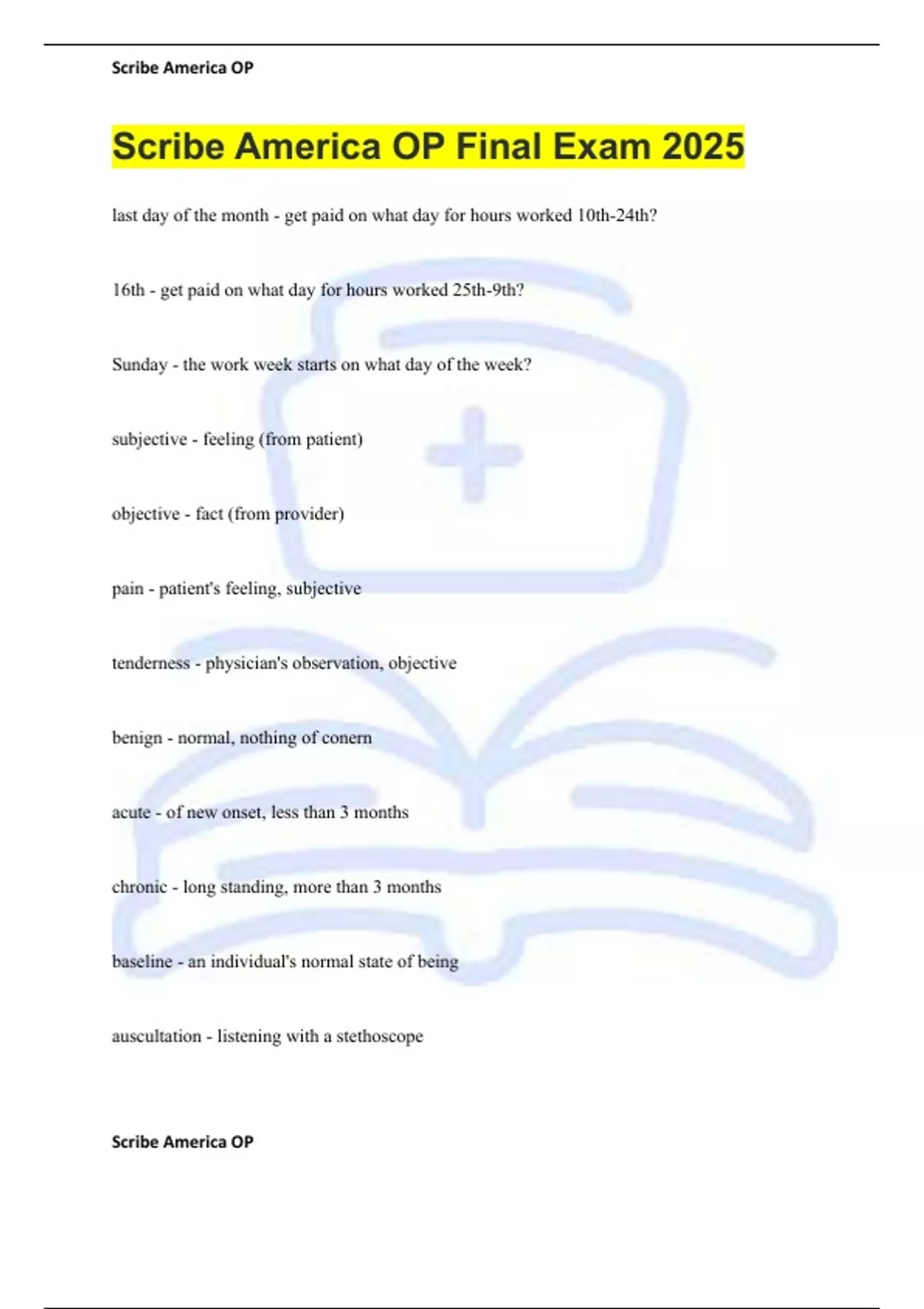 last day of the month - get paid on what day for hours worked 10th-24th? 16th - get paid on what day for hours worked 25th-9th? Sunday - the work week starts on what day of the week? subjective - feeling (from patient) objective - fact (from provider) pain - patient's feeling, subjective tenderness - physician's observation, objective benign - normal, nothing of conern acute - of new onset, less than 3 months chronic - long standing, more than 3 months baseline - an individual's normal state of being auscultation - listening with a stethoscope palpation - the act of pressing on an area by the physician inpatient - admitted to the hospital overnight outpatient - seen and sent home the same day chief complaint - the main reason for the patient's visit mid-level provider - NP or PA; works under the supervision of a physician to diagnose and treat patients medical assistant - MA or nurse who records medical histories and symptoms, monitors patient, administers medications, assists with procedures scribe - documents the patient's visit on behalf of the physician new patient - individual who has not been seen in the clinic in the past 3 years, regardless of being seen prior to 3 year absence; no previous records, longer visit, detailed chart established patient - individual who has been seen in the clinic within the past 3 years; previous records available, shorter visit, concise chart diagnostic - a clinic visit is __ if there is a new problem, CC is a new symptom, and goal is to determine the cause of the problem and appropriate treatment health management - a clinic visit is __ if it is a check-up, CC is routine physical or management of chronic problems, goal is preventative care or assessing progress of ongoing medical problems subjective - HPI, ROS, PMSHx, SHx, FHx