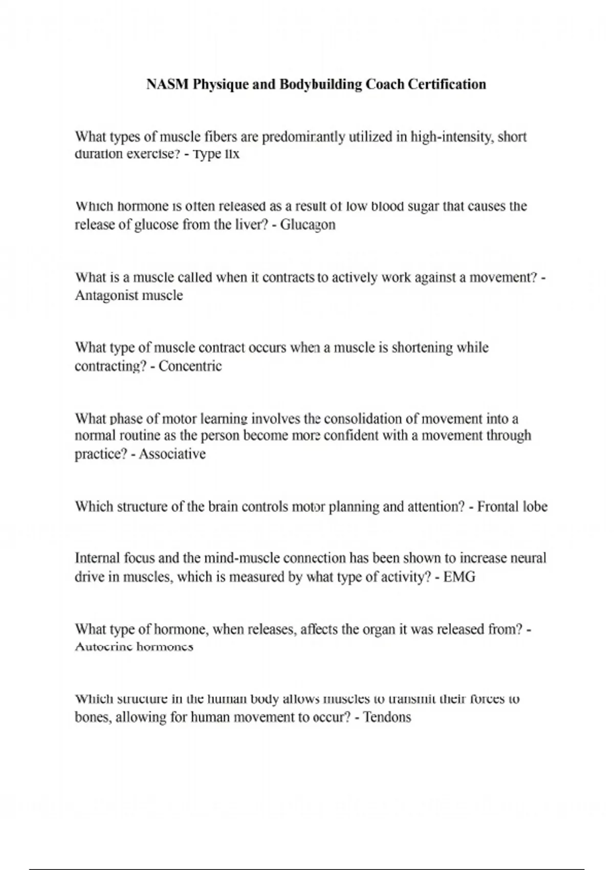 Which type of lever has the greatest mechanical advantage? - Second class lever What types of muscle fibers carry high amounts of myoglobin, an oxygen carrier within muscle fibers? - Type 1 Which part of the nervous system is responsible for increasing heart rate and blood pressure during exercise? - Sympathetic nervous system What plane is the body primarily moving in during a jumping jack? - Frontal plane Which type of focus is essential for developing the mind-muscle connection? - Internal focus What types of nerves carry signals from the brain and spinal cord to muscles? - Motor nerves What is the primary function of hyman metabolism? - to convert energy from one form to another Which law of physics helps us understand changes in body weight? - the law of the conservation of energy Which energy system is only an aerobic energy system? - the oxidative system What molecule serves as the primary phosphate donor in the phosphocreatine system help replenish adenosine triphosphate? - creatine phosphate