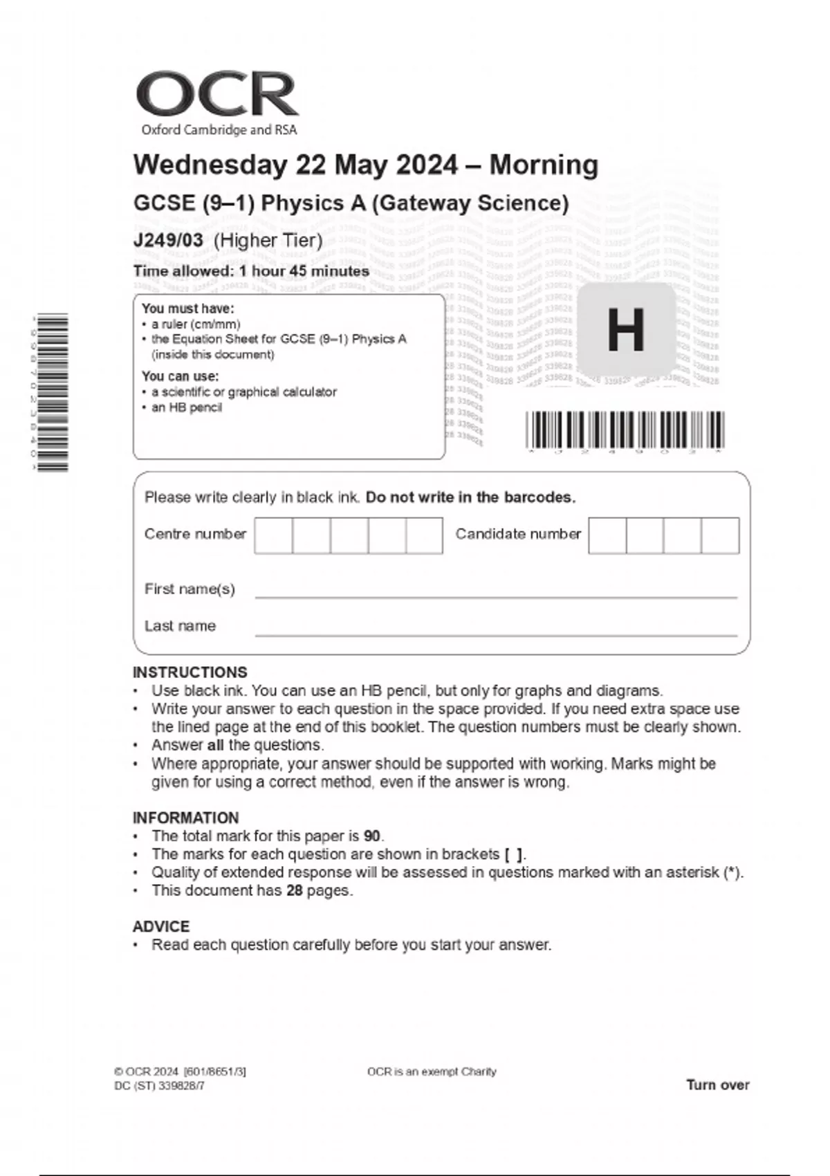 OCR GCSE (9–1) Physics A (Gateway Science) J249/03 (Higher Tier) COMBINED QUESTION PAPER AND MARKING SCHEME
