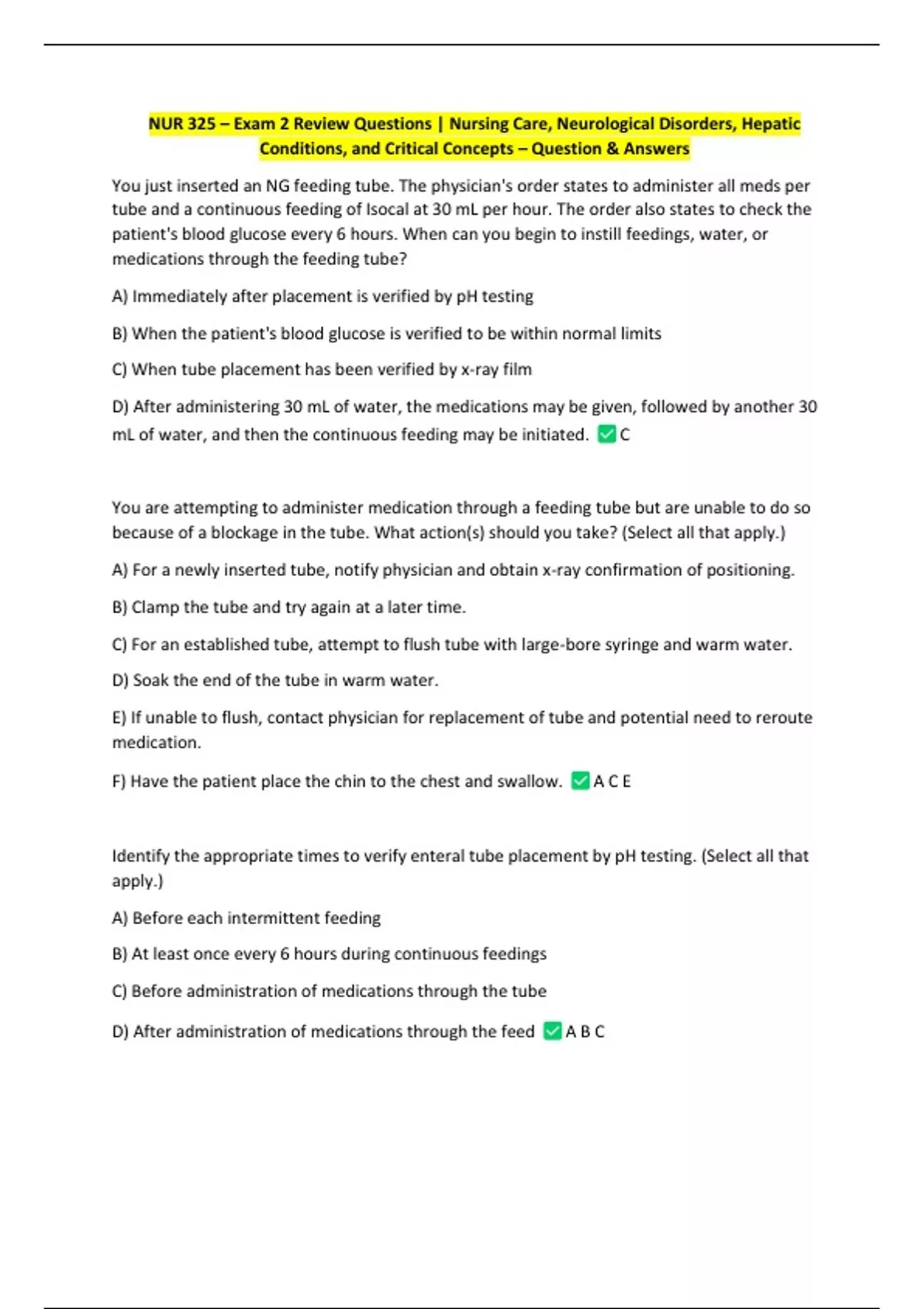 Identify the appropriate times to verify enteral tube placement by pH testing. (Select all that
