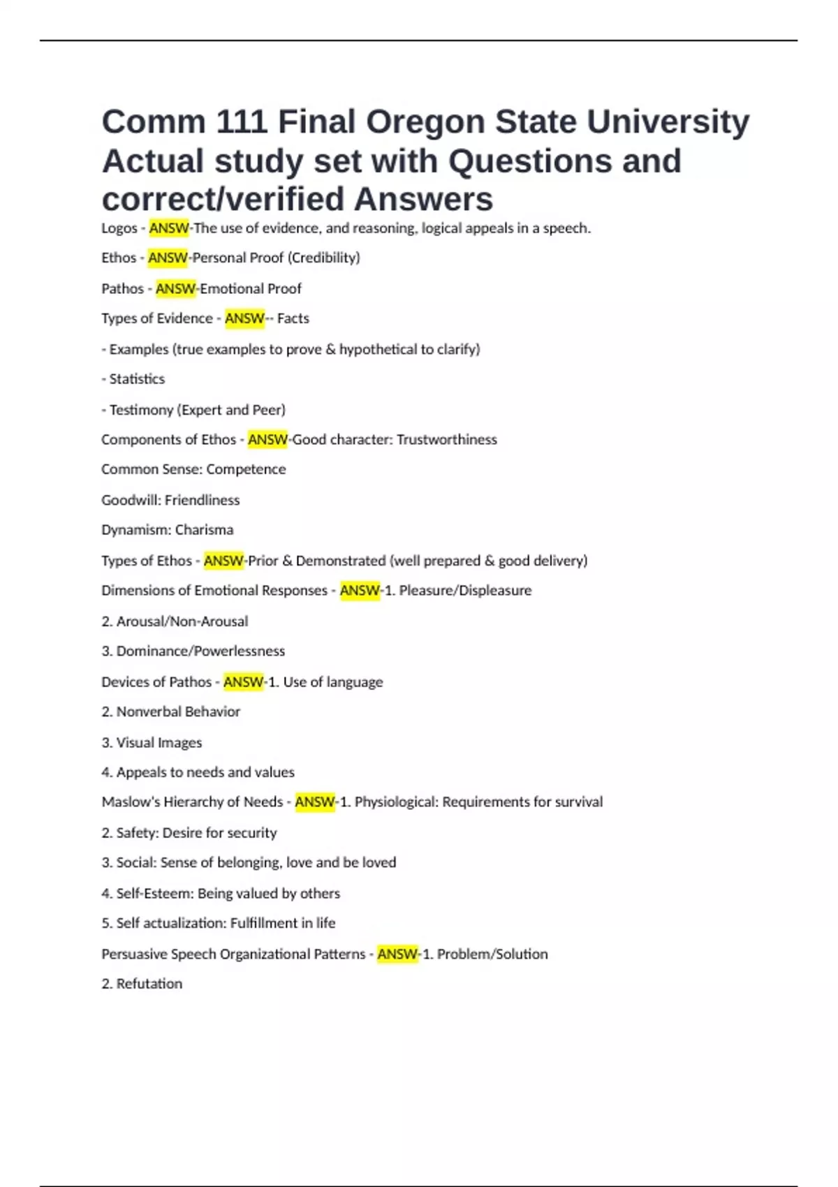 Comm 111 Final Oregon State University Actual study set with Questions and correct/verified Answers