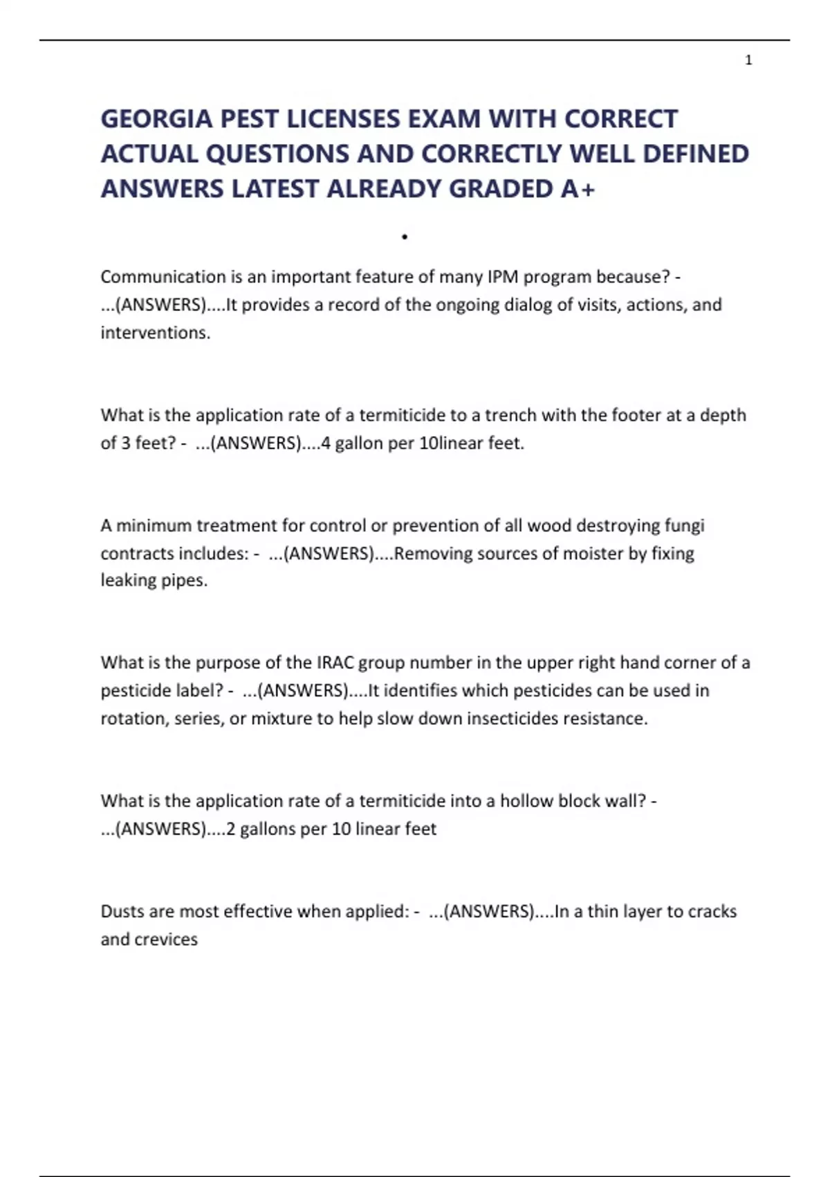 GEORGIA PEST LICENSES EXAM WITH CORRECT