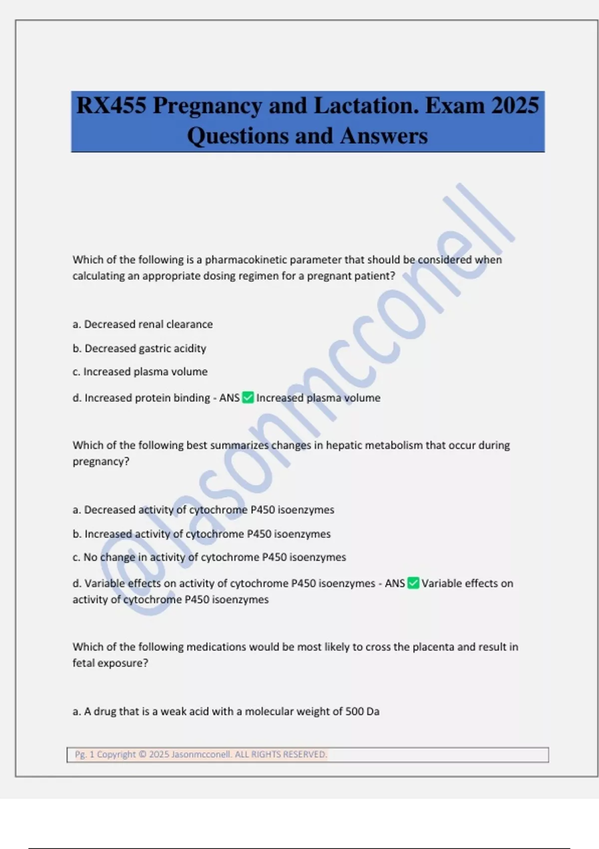 RX455 Pregnancy and Lactation. Exam 2025 Questions and Answers Which of the following is a pharmacokinetic parameter that should be considered when calculating an appropriate dosing regimen for a pregnant patient? a. Decreased renal clearance b. Decreased gastric acidity c. Increased plasma volume d. Increased protein binding - ANS Increased plasma volume Which of the following best summarizes changes in hepatic metabolism that occur during pregnancy? a. Decreased activity of cytochrome P450 isoenzymes b. Increased activity of cytochrome P450 isoenzymes c. No change in activity of cytochrome P450 isoenzymes d. Variable effects on activity of cytochrome P450 isoenzymes - ANS Variable effects on activity of cytochrome P450 isoenzymes Which of the following medications would be most likely to cross the placenta and result in fetal exposure? a. A drug that is a weak acid with a mol