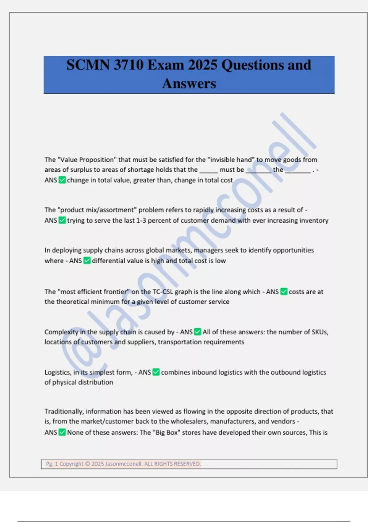 SCMN 3710 Exam 2025 Questions and Answers The "Value Proposition" that must be satisfied for the "invisible hand" to move goods from areas of surplus to areas of shortage holds that the _____ must be _______ the _______ . - ANS change in total value, greater than, change in total cost The "product mix/assortment" problem refers to rapidly increasing costs as a result of - ANS trying to serve the last 1-3 percent of customer demand with ever increasing inventory In deploying supply chains across global markets, managers seek to identify opportunities where - ANS differential value is high and total cost is low The "most efficient frontier" on the TC-CSL graph is the line along which - ANS costs are at the theoretical minimum for a given level of customer service Complexity in the supply chain is caused by - ANS All of these answers: the number of SKUs, locations of customers and suppliers, transportation requirements Logistics, in its simplest form, - ANS combines inbound logistics with the outbound logistics of physical distribution Traditionally, information has been viewed as flowing in the opposite direction of products, that is, from the market/customer back to the wholesalers, manufacturers, and vendors - ANS None of these answers: The "Big Box" stores have developed their own sources, This is Pg. 2 Copyright © 2025 Jasonmcconell. ALL RIGHTS RESERVED. still true and has not changed, Computerization has greatly increased the flow of information from the source One of the four supply chain flows in Figure 1 - 8 that has received increased attention from supply chain managers due to the growth in technology is: - ANS Demand flow Which of the answers below is an example of the creation of form utility by a logistics activity? - ANS the breaking bulk and repackaging at a distribution center Water Cruisers is located in Jacksonville, Florida, and makes small yachts and luxury pontoon boats for customers on the East coast of the United States. Each boat requires thousands of parts purchased from over 1,000 vendors. A number of boats are in production at any one time, so a large number of parts constantly arrive and are stored. Once a boat is finished, it is sailed up the coast to a convenient port for customer delivery. Which type of logistics system does Water Cruisers use? - ANS heavily inbound When a specific point in time, or level of production, is chosen and costs are developed for the various logistics cost centers, it is called - ANS short run analysis A ______ analysis examines a logistics system over a long time period or range of output. - ANS dynamic The utility that is created by moving goods from production points to market points where demand exists is referred to as: - ANS place These are designated by the U.S. secretary of the treasury for the purpose of storing, repacking, sorting or cleaning imported merchandise entered for warehousing without paying import duties while the goods are in storage. - ANS Bonded warehouses A demand-driven system