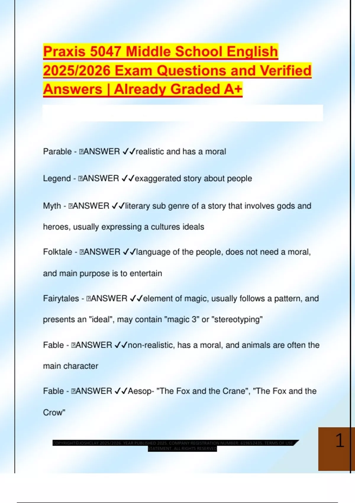 Praxis 5047 Middle School English 2025/2026 Exam Questions and Verified Answers | Already Graded A+ Parable -