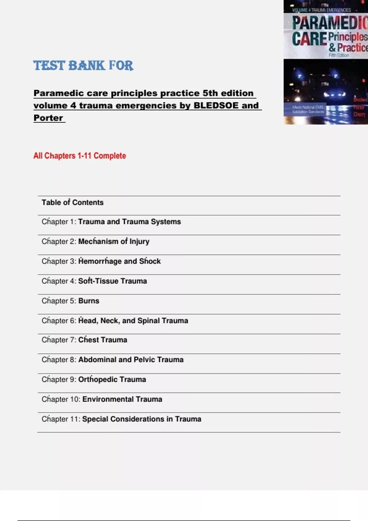 This complete test bank includes all 11 chapters from Paramedic Care: Principles & Practice, Volume 4 – Trauma Emergencies, 5th Edition by Bryan Bledsoe and Robert Porter. It features exam-style questions with verified answers covering critical trauma topics such as hemorrhage and shock, soft-tissue injuries, musculoskeletal trauma, head and spinal injuries, chest and abdominal trauma, and multi-system trauma management. Designed for paramedic students and EMS professionals preparing for trauma-focused exams and field practice.