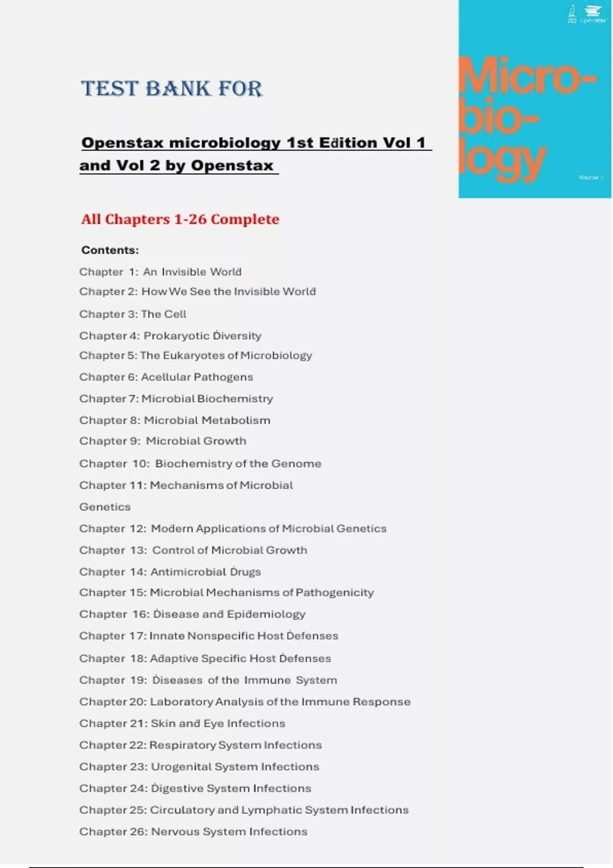 This document provides the full test bank for OpenStax Microbiology, 1st Edition, covering both Volume 1 and Volume 2, with comprehensive question sets for Chapters 1 through 26. It includes multiple-choice questions that span core microbiological concepts such as microbial structure and function, genetics, immunity, pathogenesis, and applied microbiology. Suitable for exam review, classroom testing, or independent study