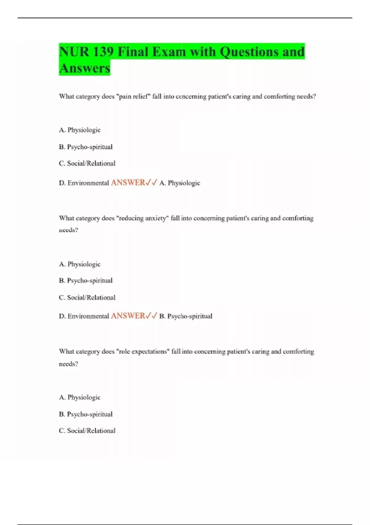 NUR 139 Final Exam with Questions and Answers What category does "pain relief" fall into concerning patient's caring and comforting needs? A. Physiologic B. Psycho-spiritual C. Social/Relational D. Environmental ANSWER A. Physiologic What category does "reducing anxiety" fall into concerning patient's caring and comforting needs? A. Physiologic B. Psycho-spiritual C. Social/Relational D. Environmental ANSWER B. Psycho-spiritual What category does "role expectations" fall into concerning patient's caring and comforting needs? A. Physiologic B. Psycho-spiritual C. Social/Relational