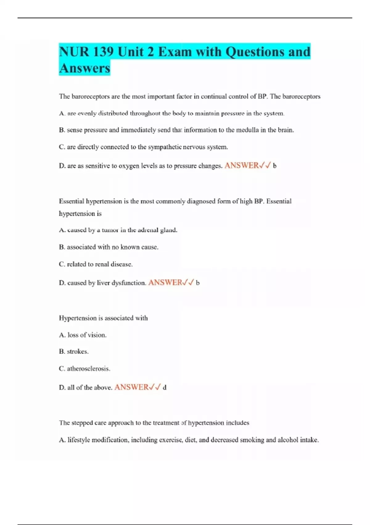 NUR 139 Unit 2 Exam with Questions and Answers The baroreceptors are the most important factor in continual control of BP. The baroreceptors A. are evenly distributed throughout the body to maintain pressure in the system. B. sense pressure and immediately send that information to the medulla in the brain. C. are directly connected to the sympathetic nervous system. D. are as sensitive to oxygen levels as to pressure changes. ANSWER b Essential hypertension is the most commonly diagnosed form of high BP. Essential hypertension is A. caused by a tumor in the adrenal gland. B. associated with no known cause. C. related to renal disease. D. caused by liver dysfunction. ANSWER b Hypertension is associated with A. loss of vision. B. strokes. C. atherosclerosis. D. all of the above. ANSWER d The stepped care approach to the treatment of hypertension includes