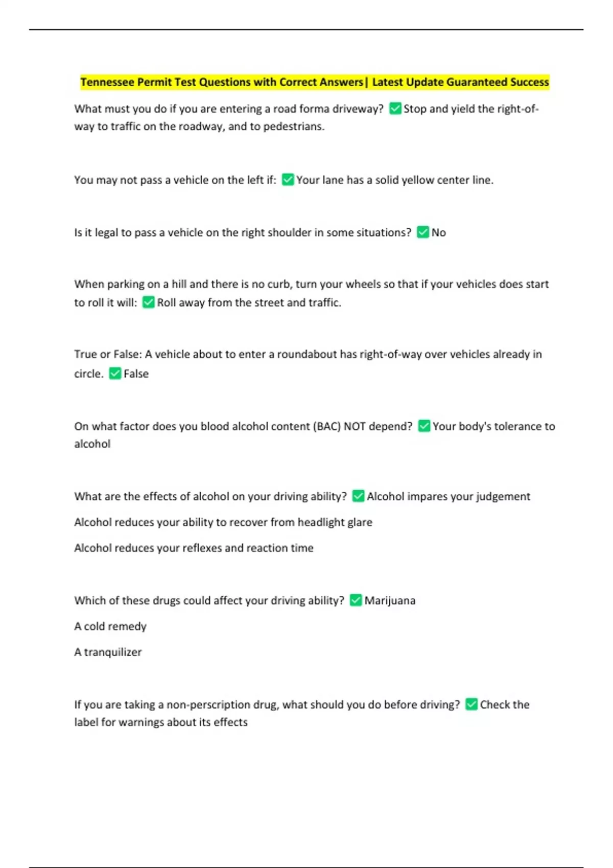 Tennessee Permit Test Questions with Correct Answers| Latest Update Guaranteed Success