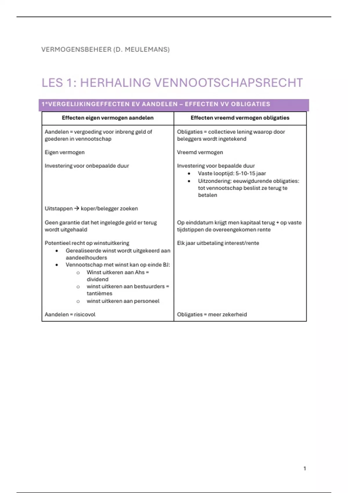 1°VERGELIJKINGEFFECTEN EV AANDELEN – EFFECTEN VV OBLIGATIES