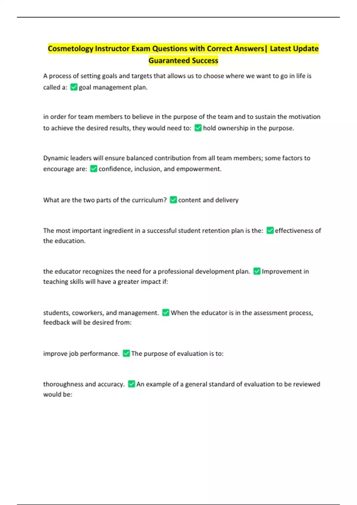 Cosmetology Instructor Exam Questions with Correct Answers| Latest Update Guaranteed Success