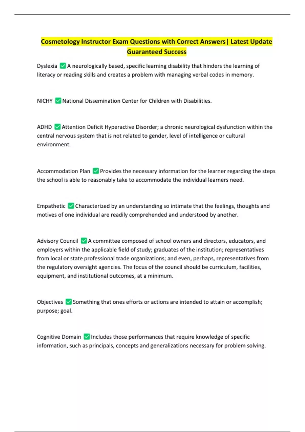 Cosmetology Instructor Exam Questions with Correct Answers| Latest Update Guaranteed Success